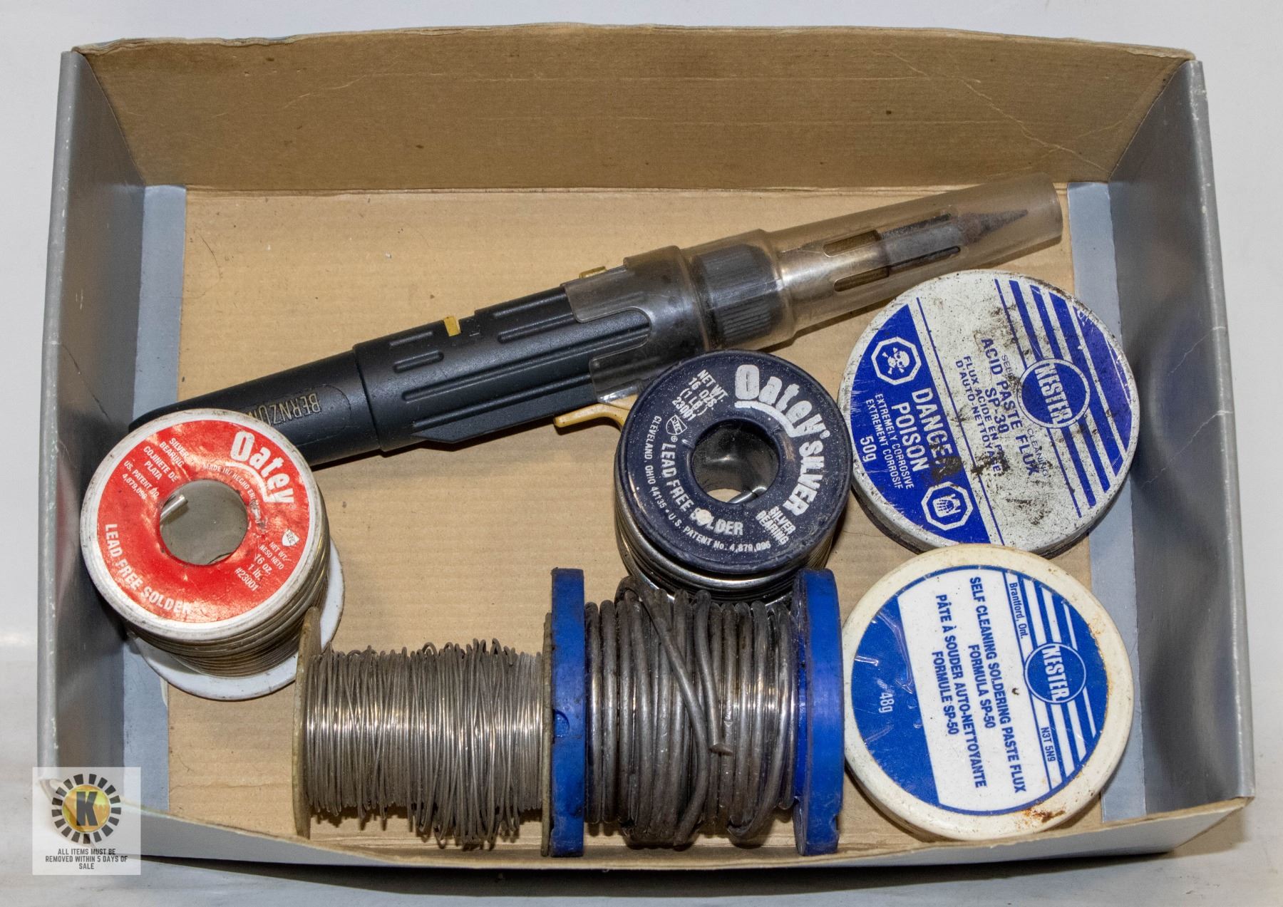 OF FLUX AND BENZOMATIC GAS SOLDERING IRON, SEVERAL TYPES AND SIZES OF SOLDER INCL. OATEY SILVER ROLLS **ALL ITEMS MUST BE REMOVED BY 5PM SATURDAY, APRIL 3RD 2025. ALL REMAINING ITEMS WILL BE SUBJECT TO A $6.00 PER DAY STORAGE CHARGE. ANY ITEMS REMAINING AFTER MONDAY, MAY 19TH 2025 WILL BE CONSIDERED FORFEITED. NO REFUNDS WILL BE ISSUED FOR FORFEITED ITEMS. TO SCHEDULE A PICK UP APPOINTMENT CLICK HERE
