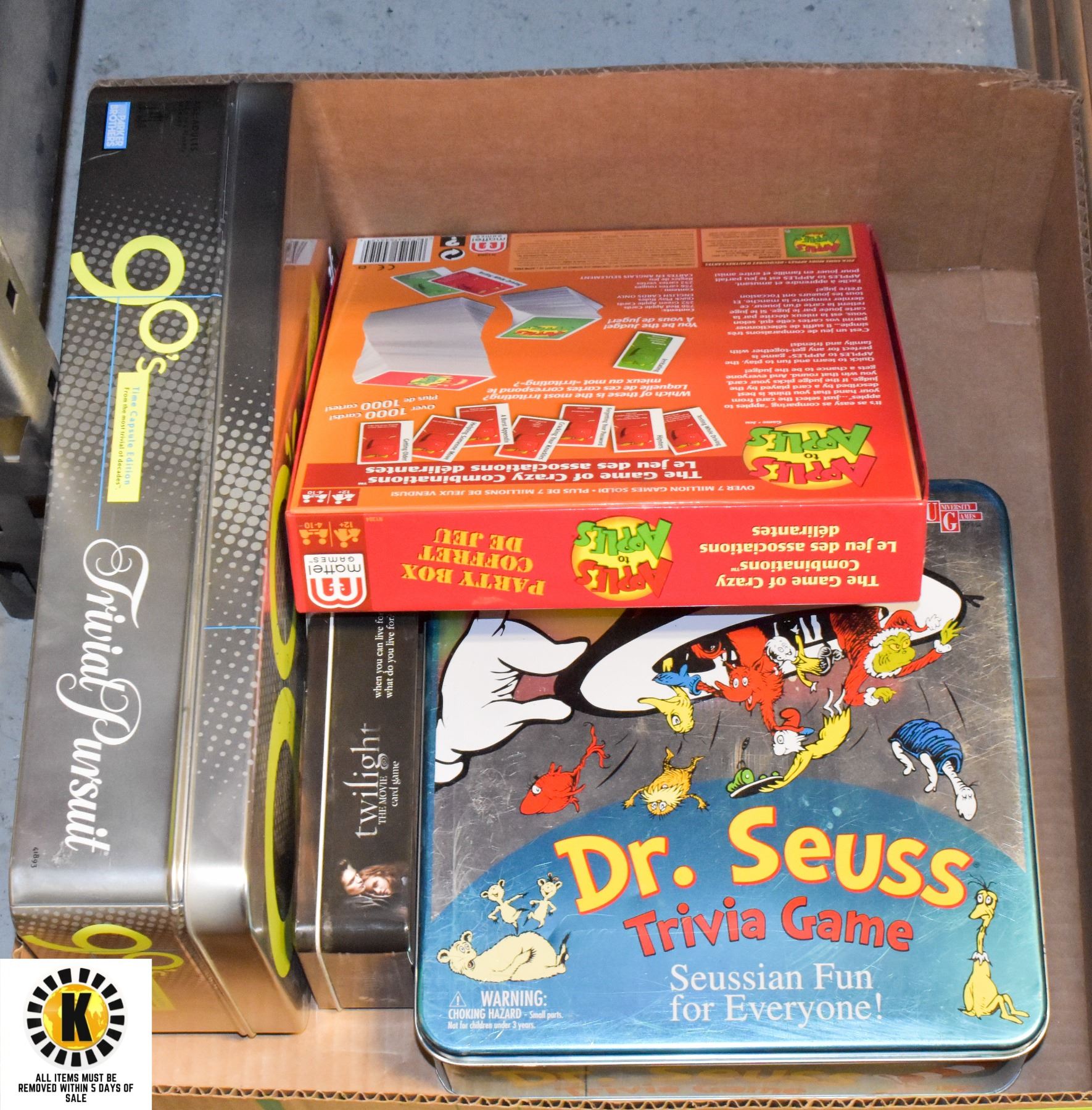 TRIVIA GAME IN TIN - TRIVIAL PURSUIT, 90'S TIME CAPSULE, APPLES TO APPLES AND TWILIGHT THE MOVIE CARD GAME