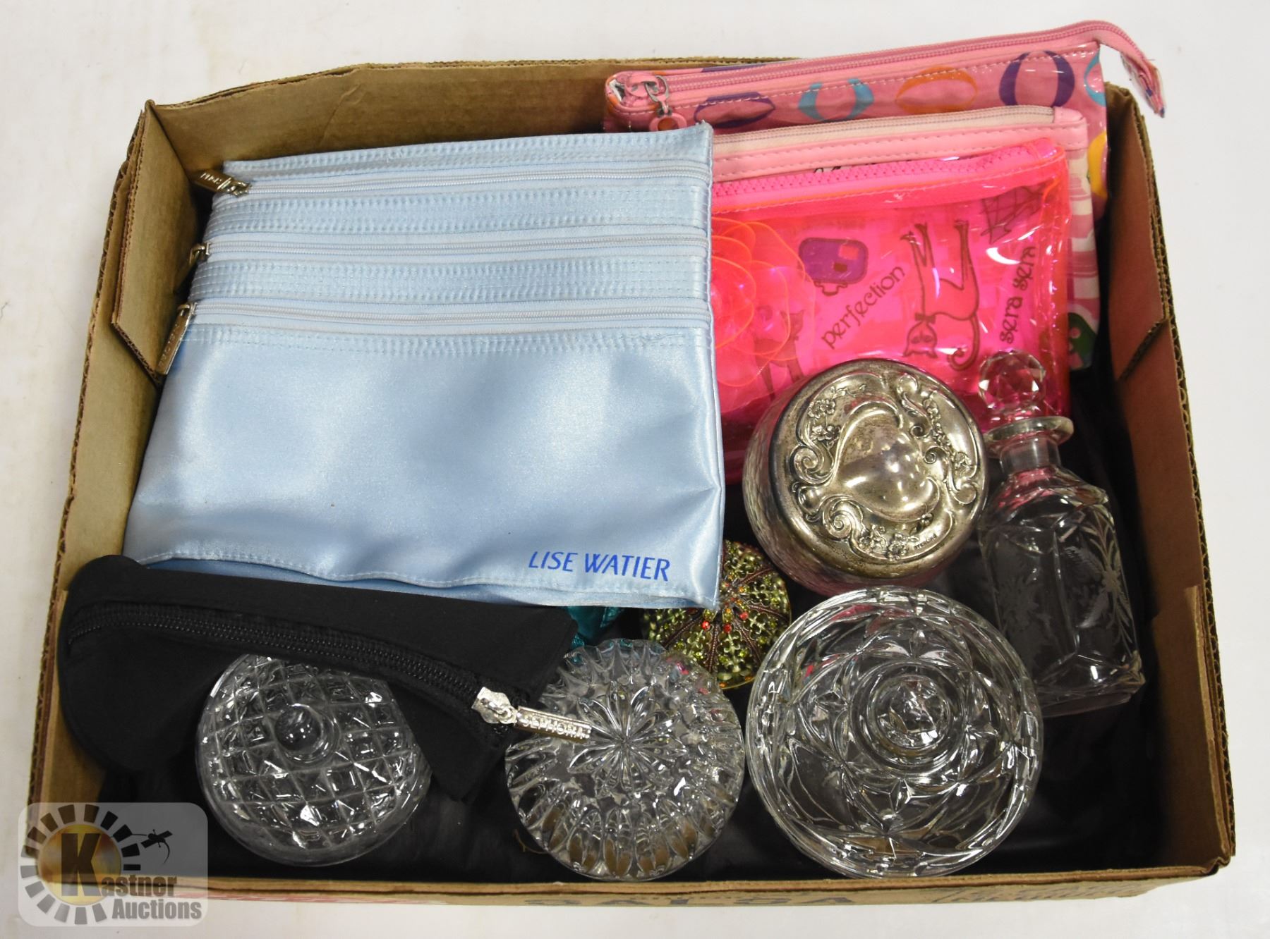CROWN TRINKET CONTAINER AND 5 MAKEUP/TRAVEL BAGS INCLUDING VICTORIA SECRET, SEPHORA & LISE WATIER