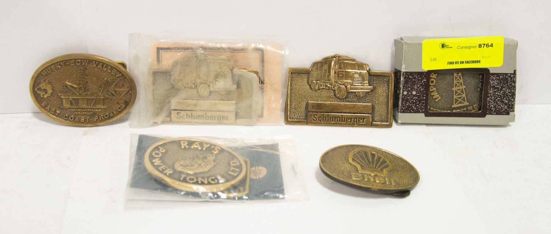 BOX WITH 6 VINTAGE OILFIELD BELT BUCKLES