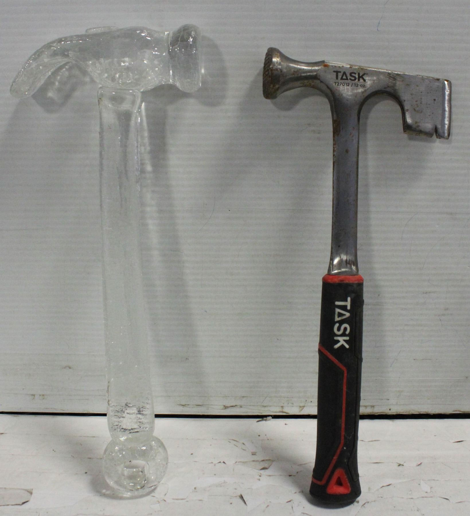BOX WITH A GLASS HAMMER AND A STEEL HAMMER