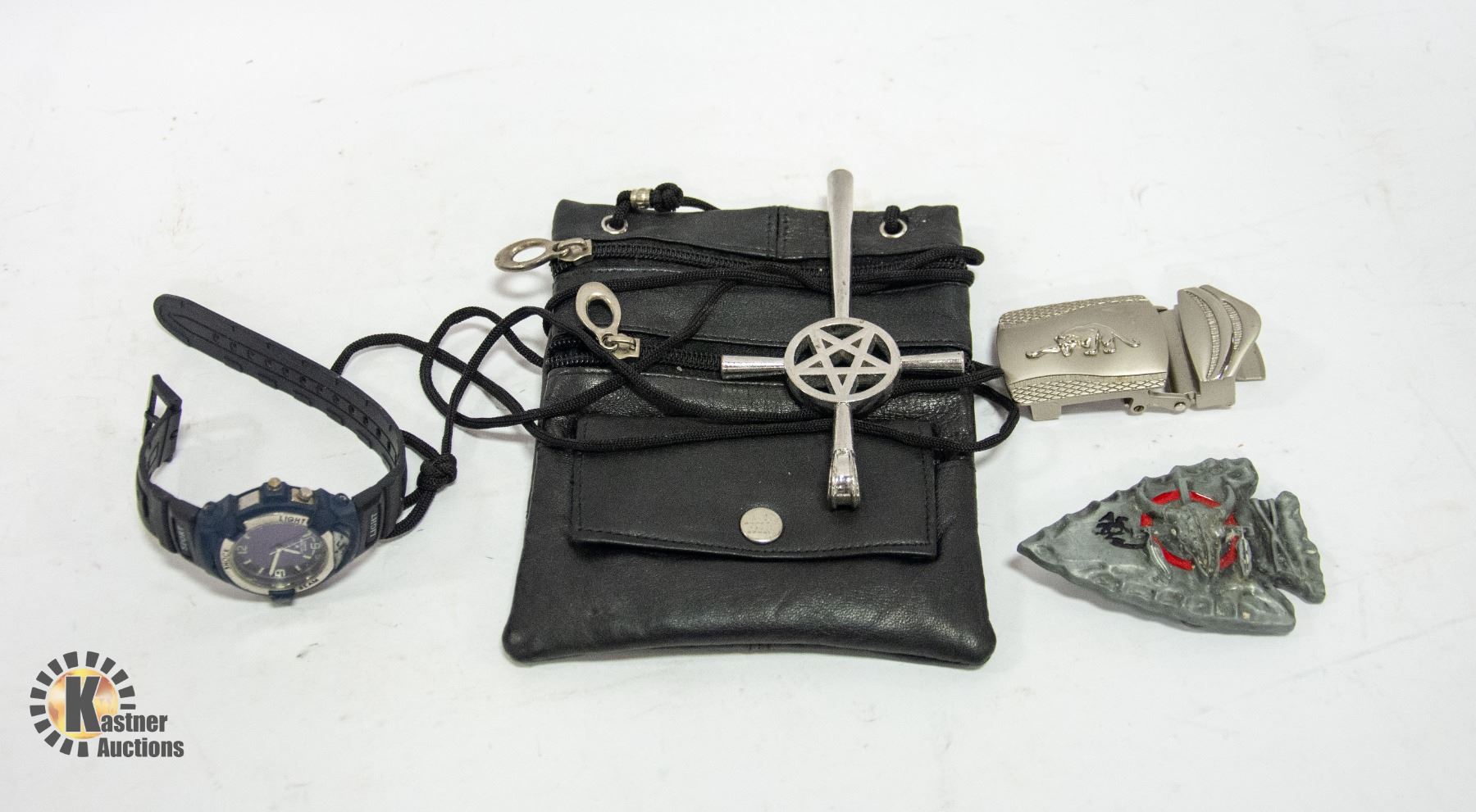 BELT BUCKLE, PENTAGRAM DESIGN PENDANT, MEN'S SPORTS WATCH & SLIM SOFT LEATHER NECK PURSE POUCH TRAVEL ORGANIZER **ALL ITEMS MUST BE REMOVED BY 5PM SATURDAY, FEBRUARY 10TH 2024. ALL REMAINING ITEMS WILL BE SUBJECT TO A $6.00 PER DAY STORAGE CHARGE. ANY ITEMS REMAINING AFTER MONDAY, FEBRUARY 26TH, 2023 WILL BE CONSIDERED FORFEITED. NO REFUNDS WILL BE ISSUED FOR FORFEITED ITEMS. TO SCHEDULE A PICK UP APPOINTMENT CLICK HERE