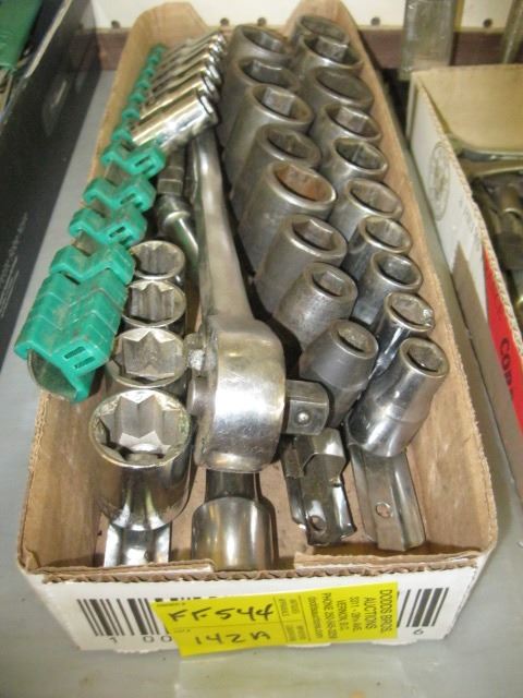 BOX WITH ASSORTED 1/2" RATCHET, IMPACT & REGULAR SOCKETS ETC.