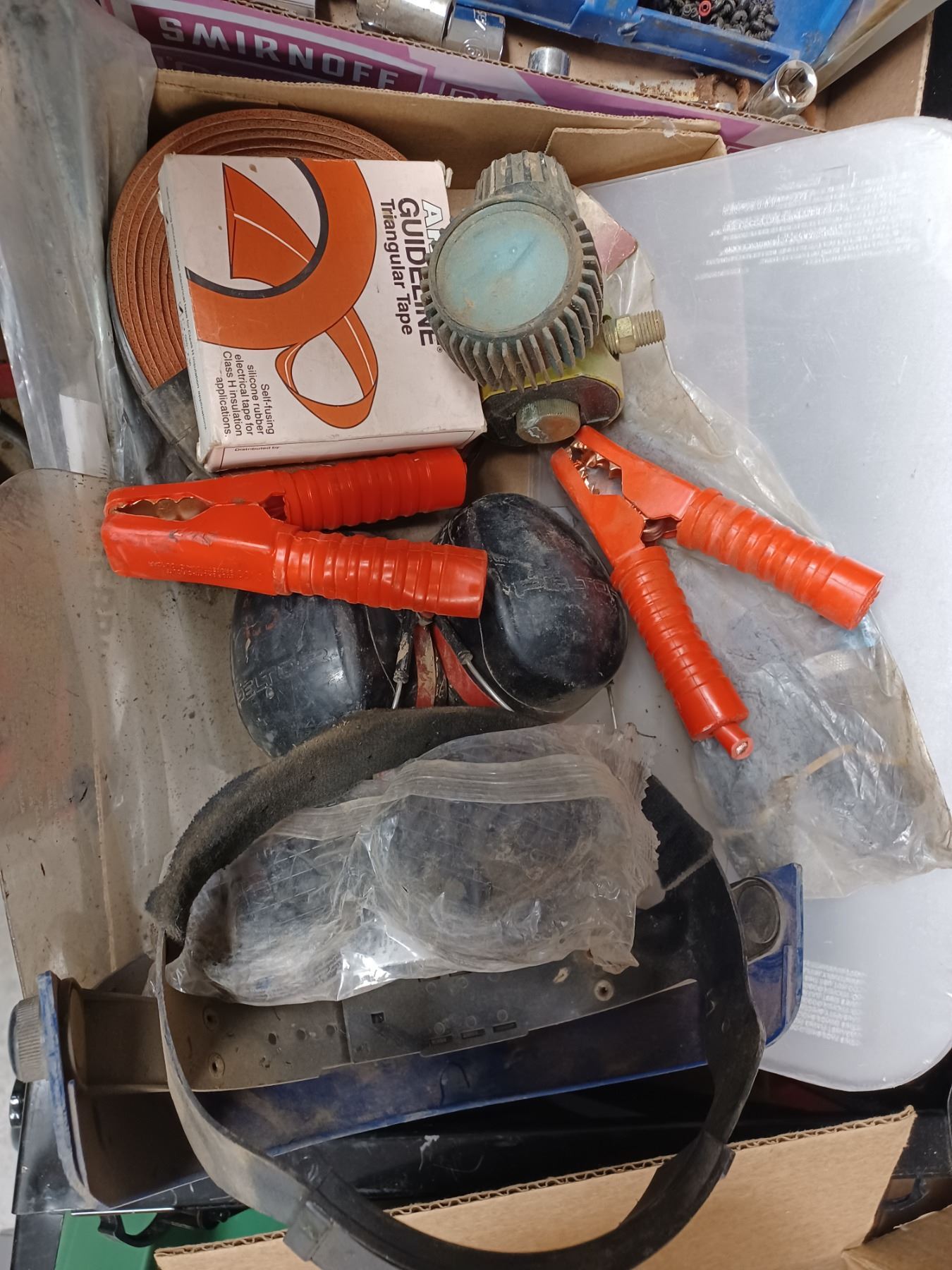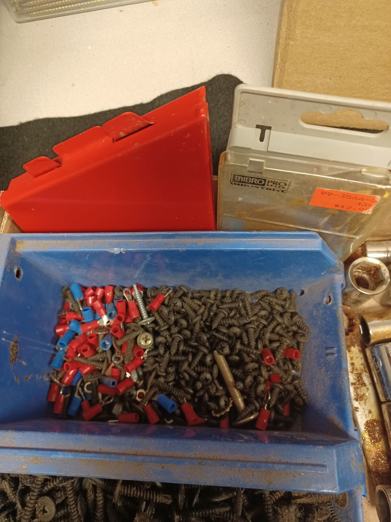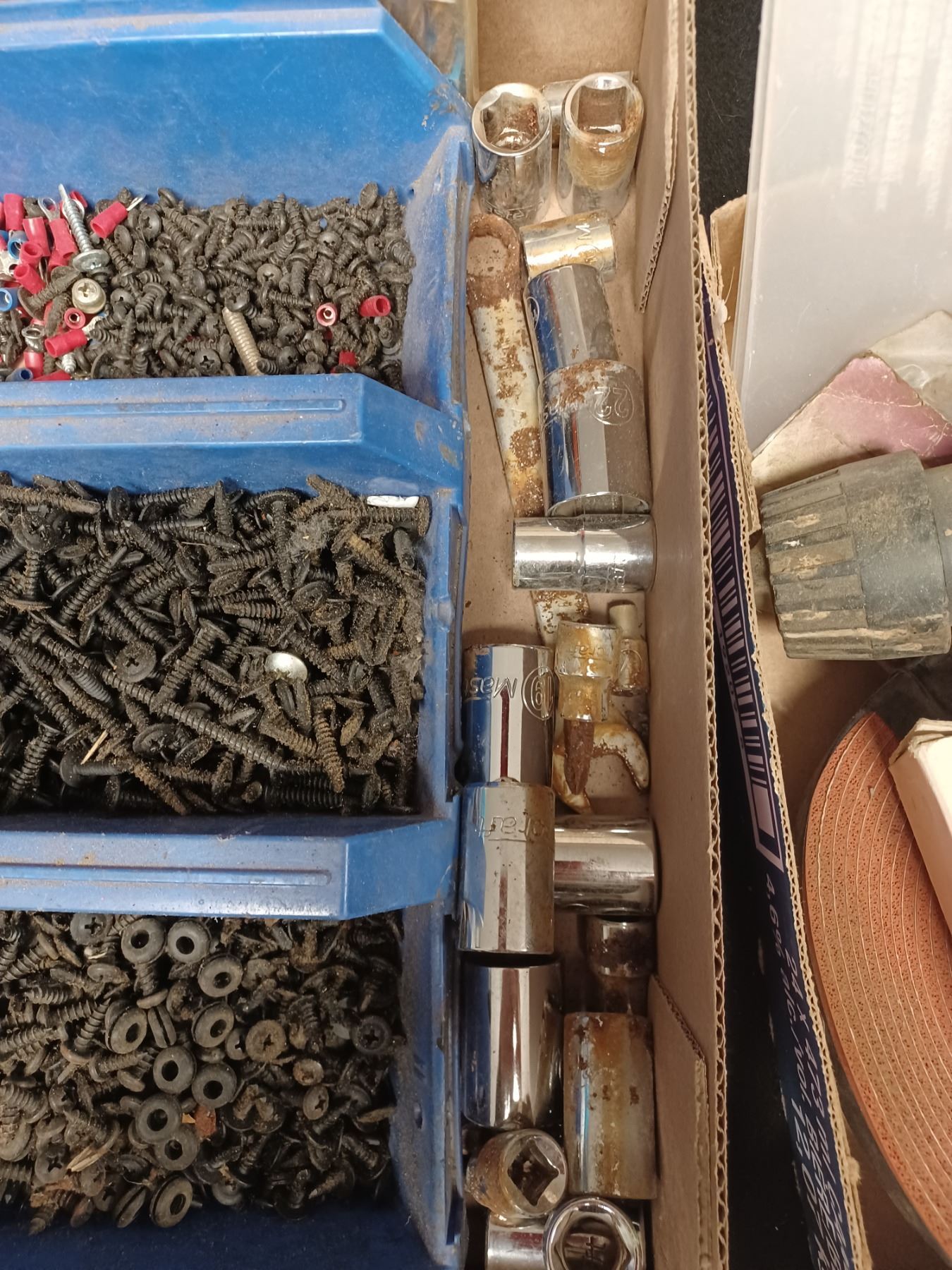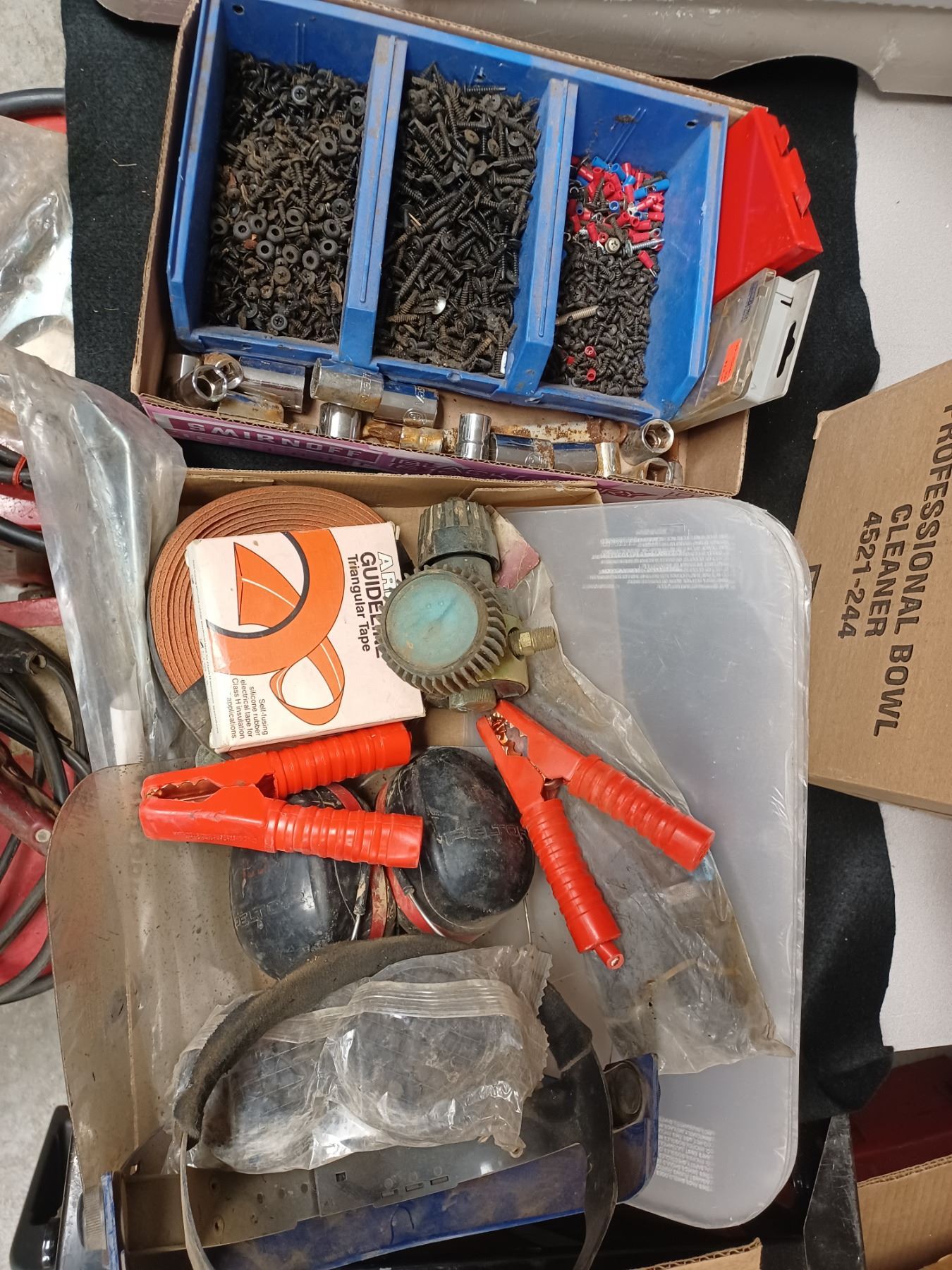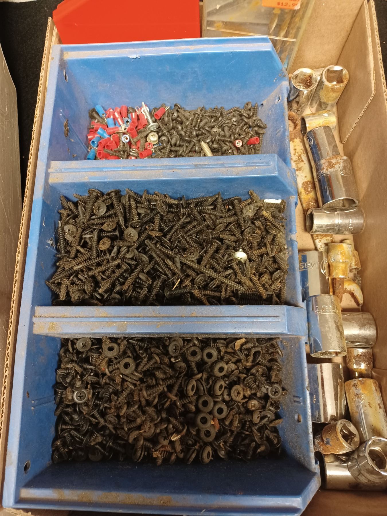 BOX WITH ASSORTED ITEMS AND BOX WITH ASSORTED SCREWS, DRILL BITS, AND SOCKETS