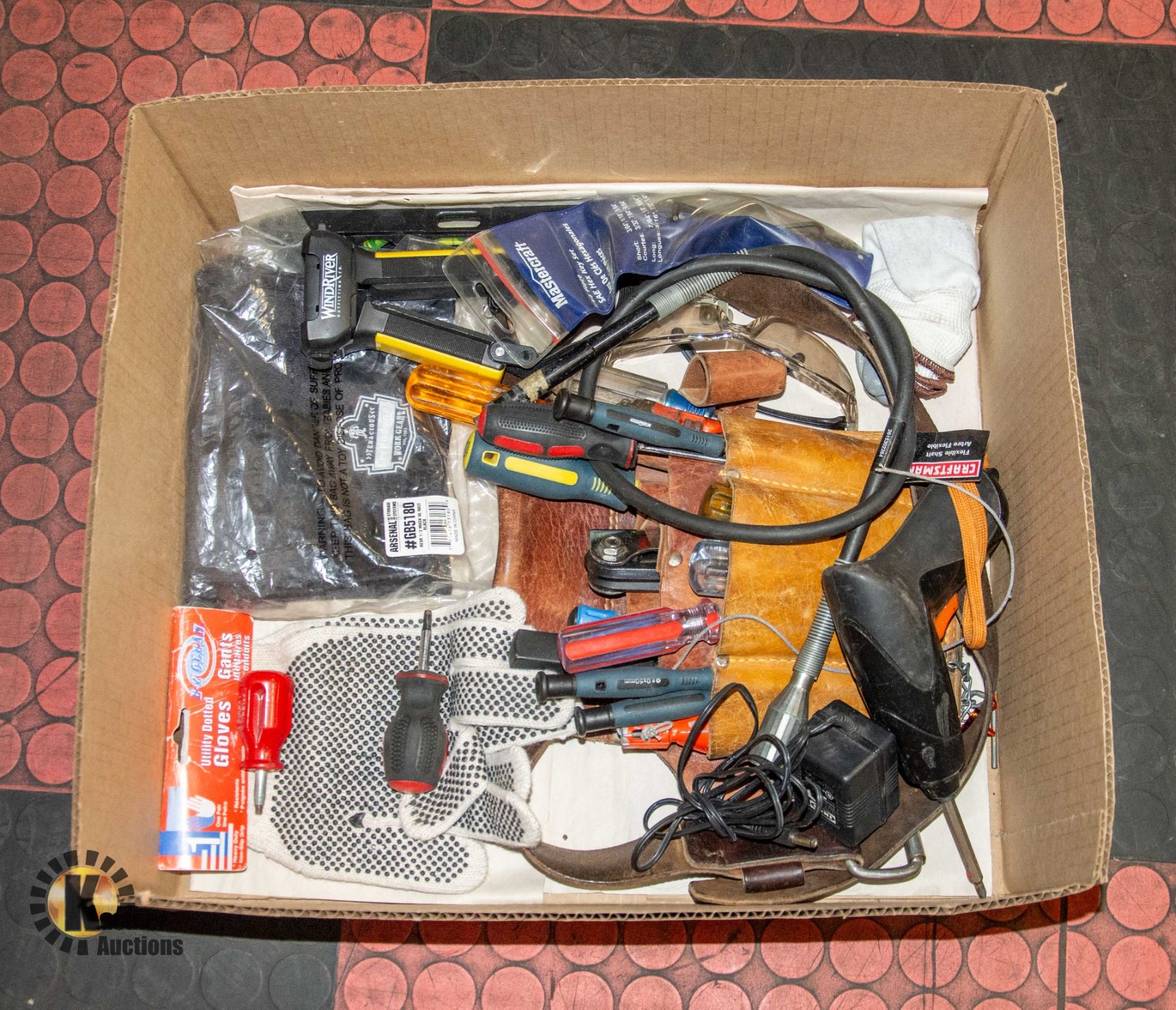 AND ACCESSORIES INCL. LEATHER TOOL BELT WITH TOOL POUCH FULL OF TOOLS, NEW GLOVES, NEW WORK GEAR TOUQUE, ASSORTMENT OF TOOLS AND OTHER WORK GEAR **ALL ITEMS MUST BE REMOVED BY 5PM SATURDAY, FEBRUARY 24TH 2024. ALL REMAINING ITEMS WILL BE SUBJECT TO A $6.00 PER DAY STORAGE CHARGE. ANY ITEMS REMAINING AFTER MONDAY, MARCH 11TH, 2023 WILL BE CONSIDERED FORFEITED. NO REFUNDS WILL BE ISSUED FOR FORFEITED ITEMS. TO SCHEDULE A PICK UP APPOINTMENT CLICK HERE