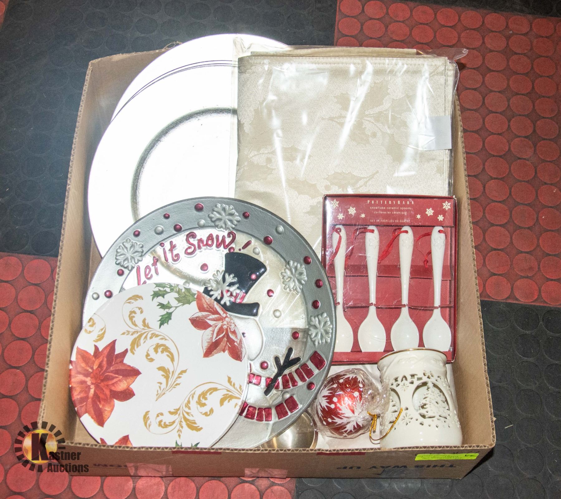 PLACEMATS, NEW POTTERBARN SNOWFLAKE CERAMIC SPOONS, 5 SILVER CHARGER PLATES, 1 GLASS ART SNOWMAN PLATE, NEW HOLIDAY WISHES 4-PLATE GIFT SET, CERAMIC AROMATHERAPY DIFFUSER, CHRISTMAS TREE DECOR, CIRCULAR CANDLES, ETC. **ALL ITEMS MUST BE REMOVED BY 5PM SATURDAY, DECEMBER 7TH 2024. ALL REMAINING ITEMS WILL BE SUBJECT TO A $6.00 PER DAY STORAGE CHARGE. ANY ITEMS REMAINING AFTER MONDAY, DECEMBER 23RD 2024 WILL BE CONSIDERED FORFEITED. NO REFUNDS WILL BE ISSUED FOR FORFEITED ITEMS. TO SCHEDULE A PICK UP APPOINTMENT CLICK HERE