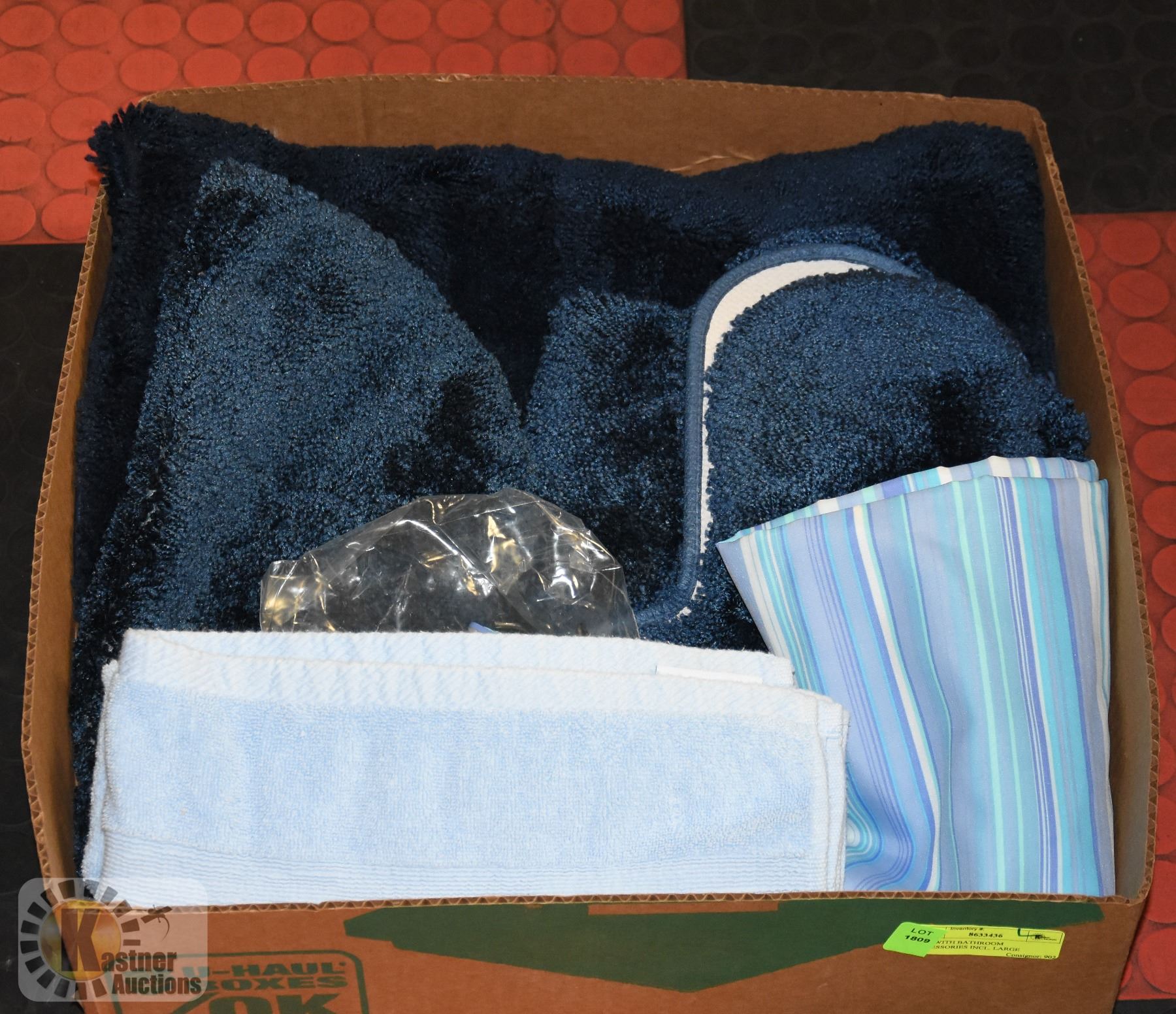 BLUE BATH MAT/VANITY MAT (24"W X 40"L), TOILET COVER & CONTOUR SET, BLUE STRIPPED SHOWER CURTAIN AND SHOWER CURTAIN HANGERS & BLUE BATH TOWEL