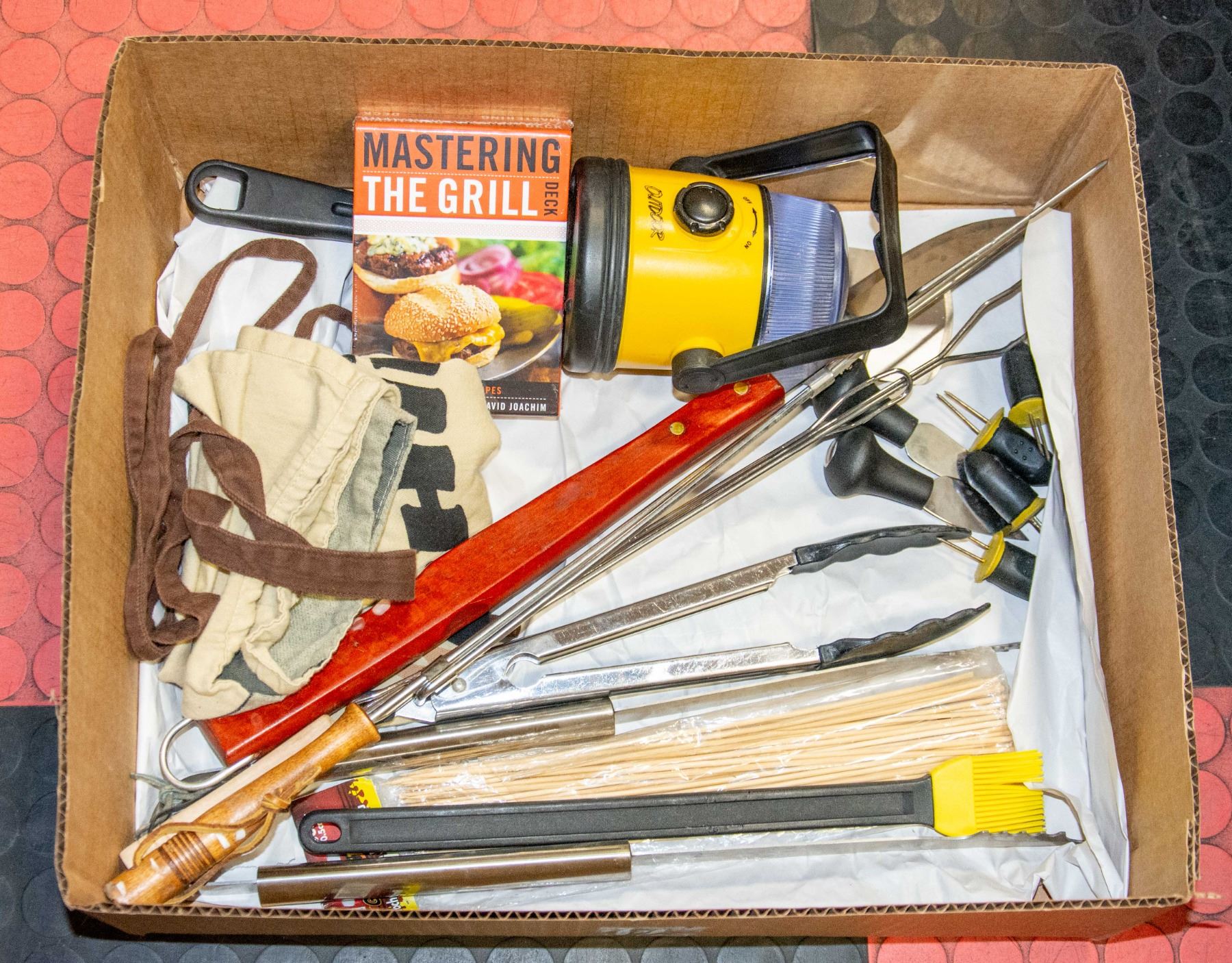 NEW "MASTERING THE GRILL" 50-CARD RECIPE DECK, LONG KNIFE, FLIPPER, TONGS, OUTDOOR LAMP, GRILL APRON