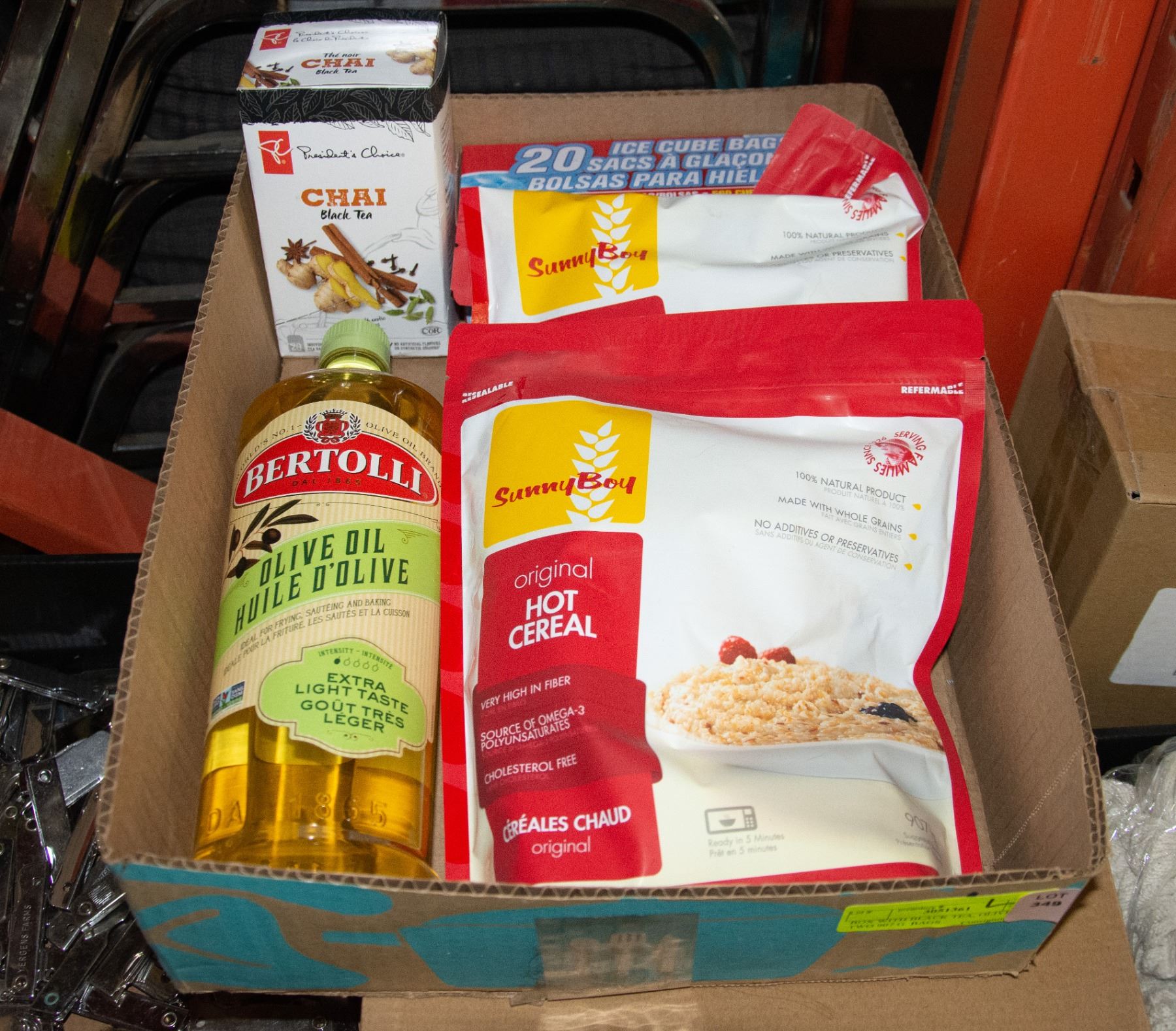 BOX WITH BLACK TEA, OLIVE OIL, TWO 907 G. BAGS
