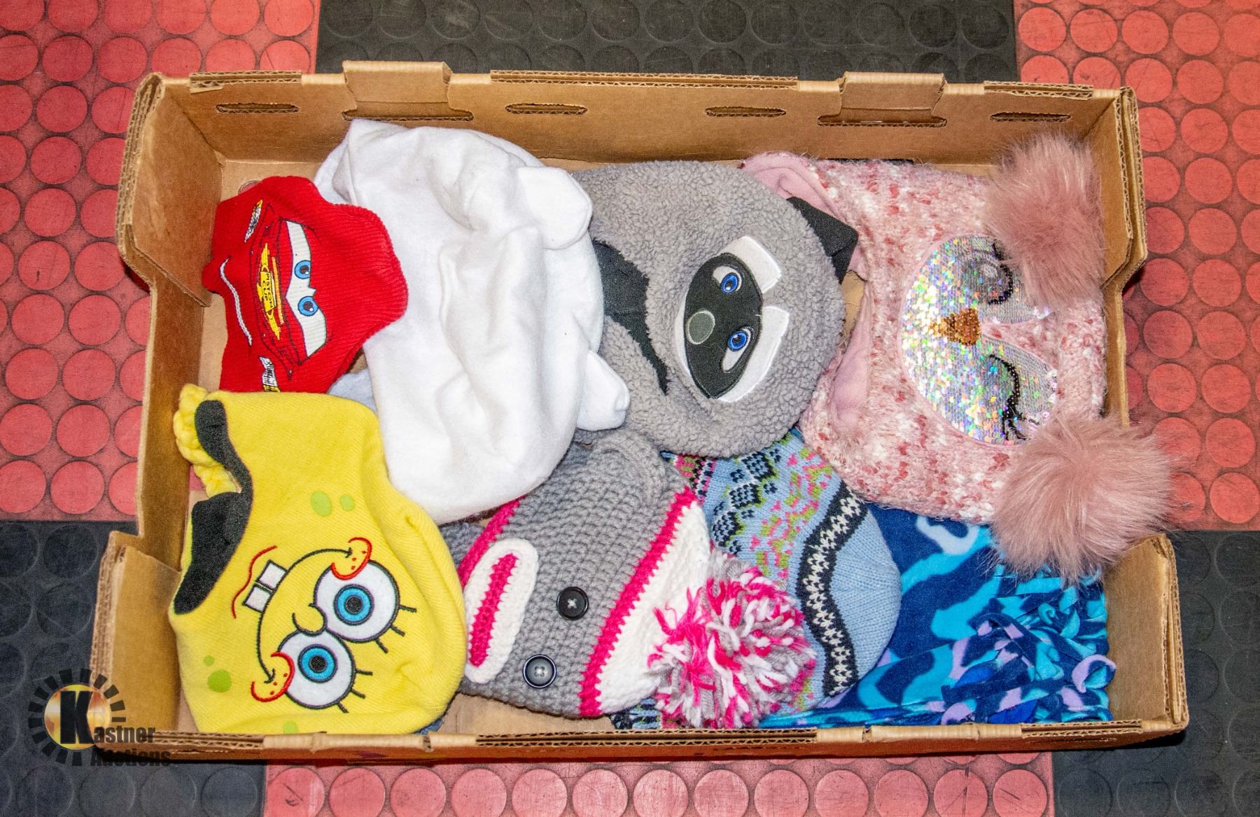 BOX WITH BLUE SCARF AND 7 KIDS TOUQUES