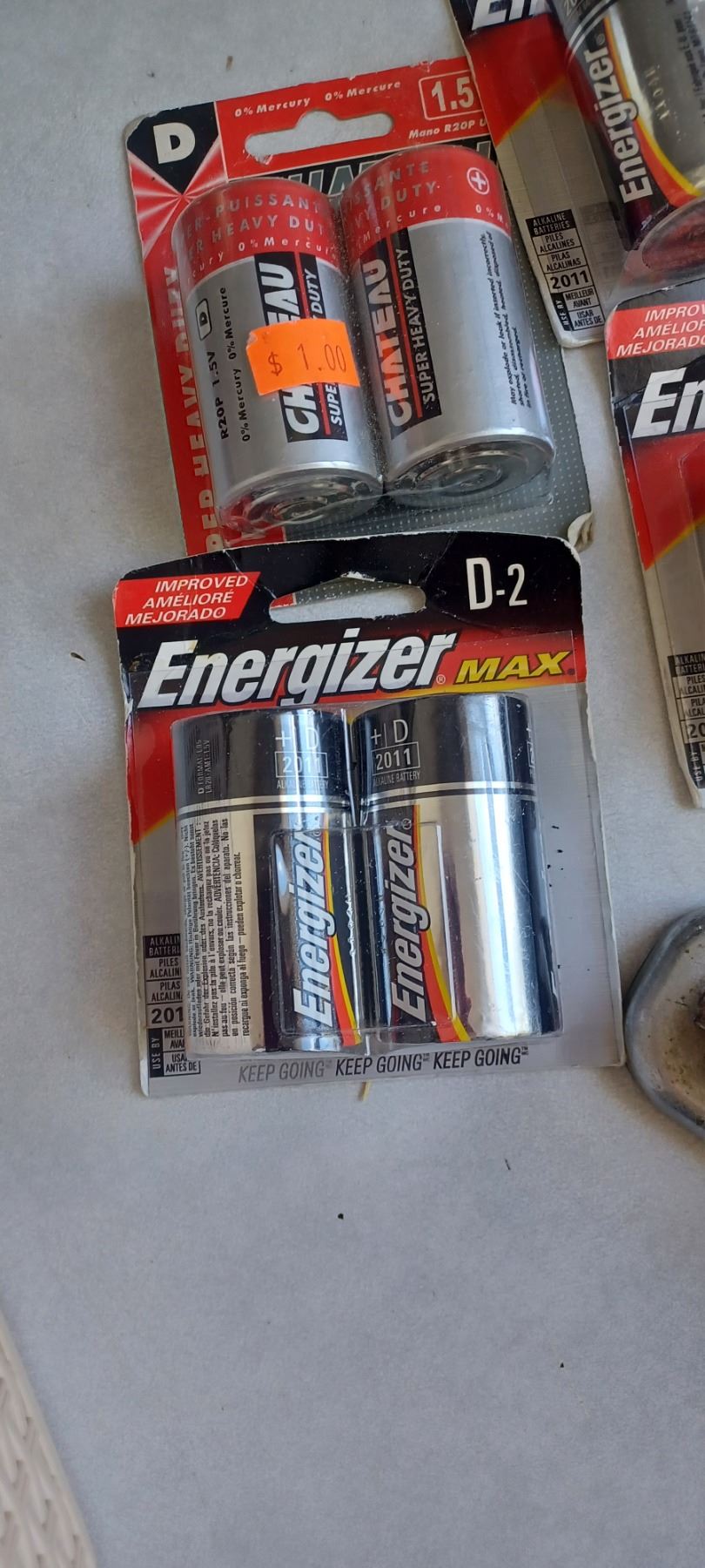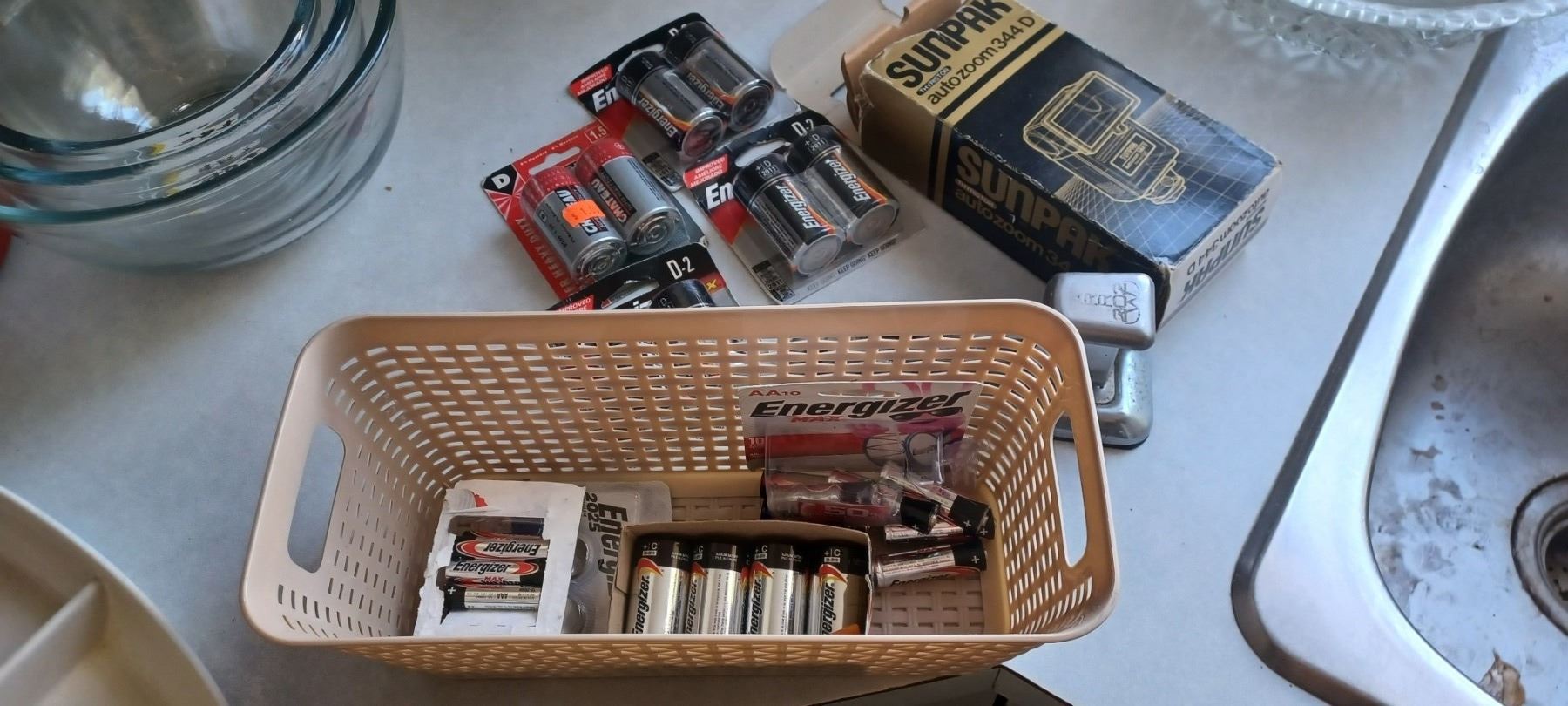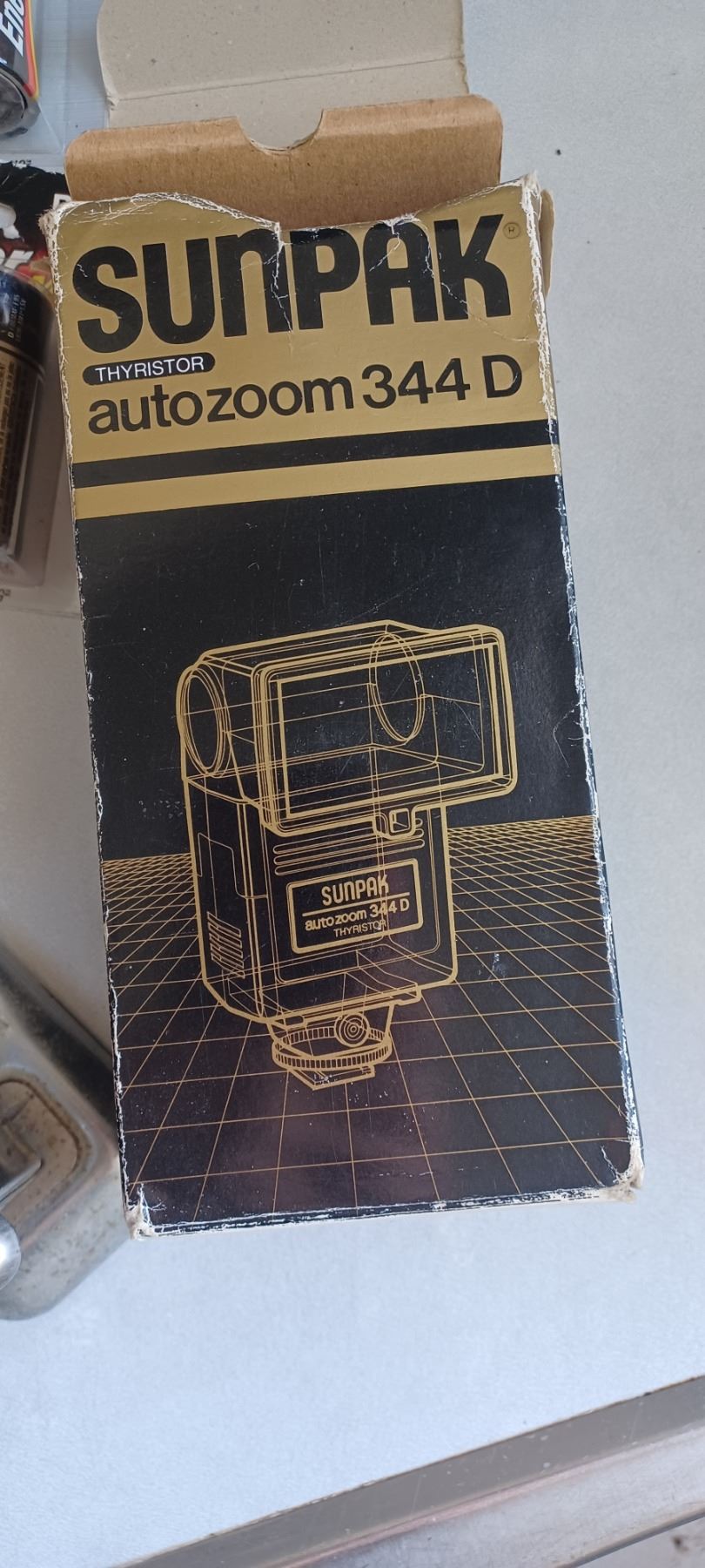 BOX WITH CAMERA FLASH ATTACHMENT AND ASSORTED BATTERIES