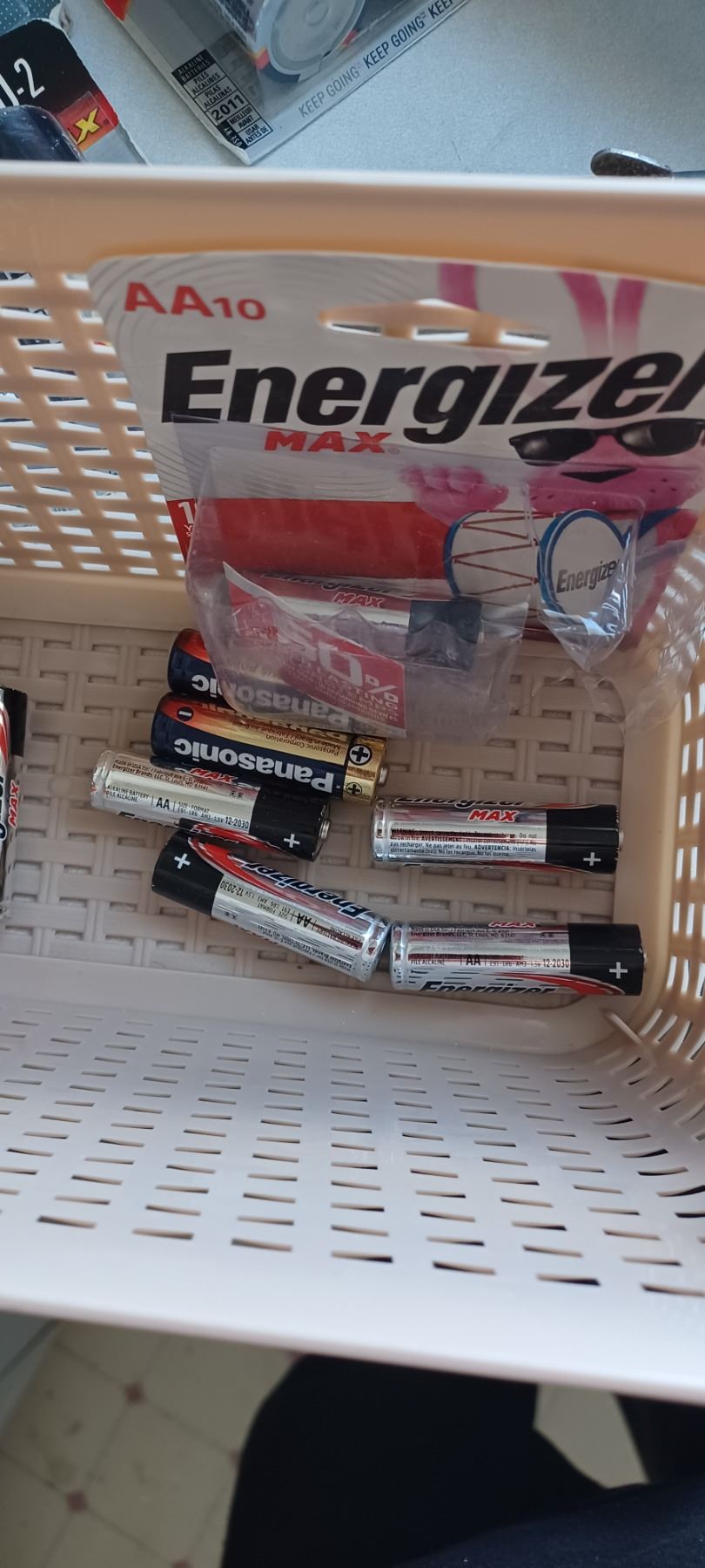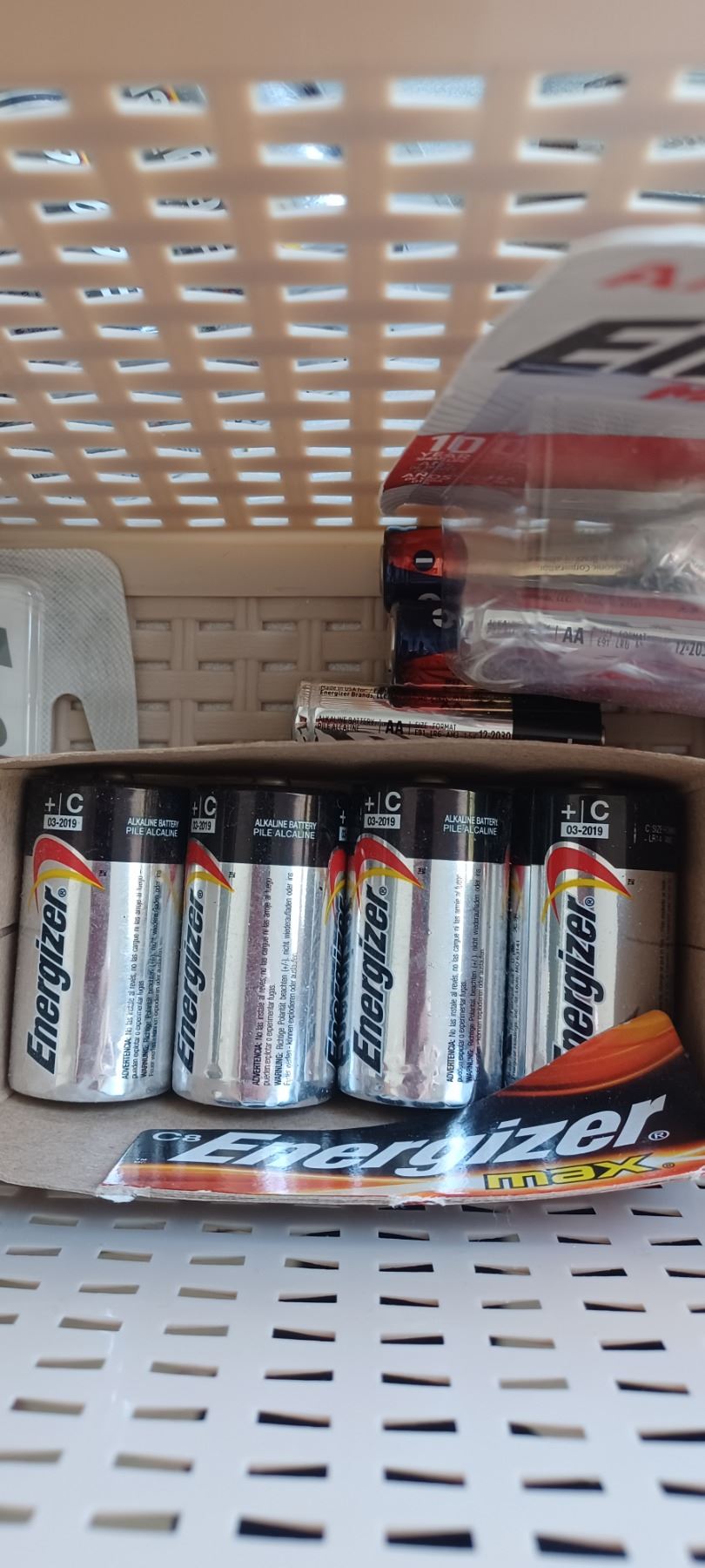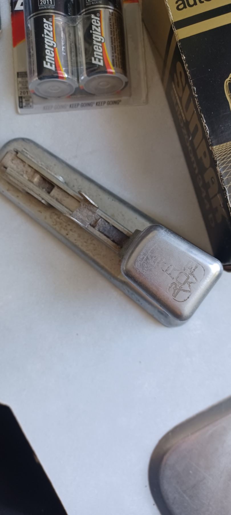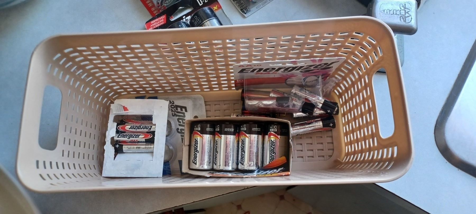 BOX WITH CAMERA FLASH ATTACHMENT AND ASSORTED BATTERIES