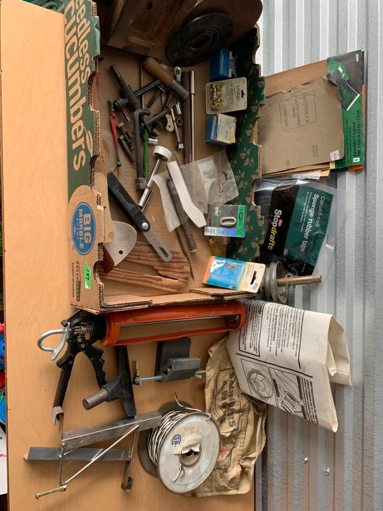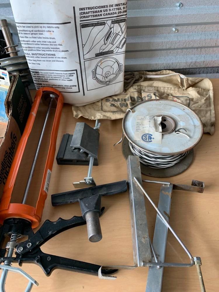 BOX WITH CAULKING GUN, STOP DRAFT, SANDING SHEETS, ETC
