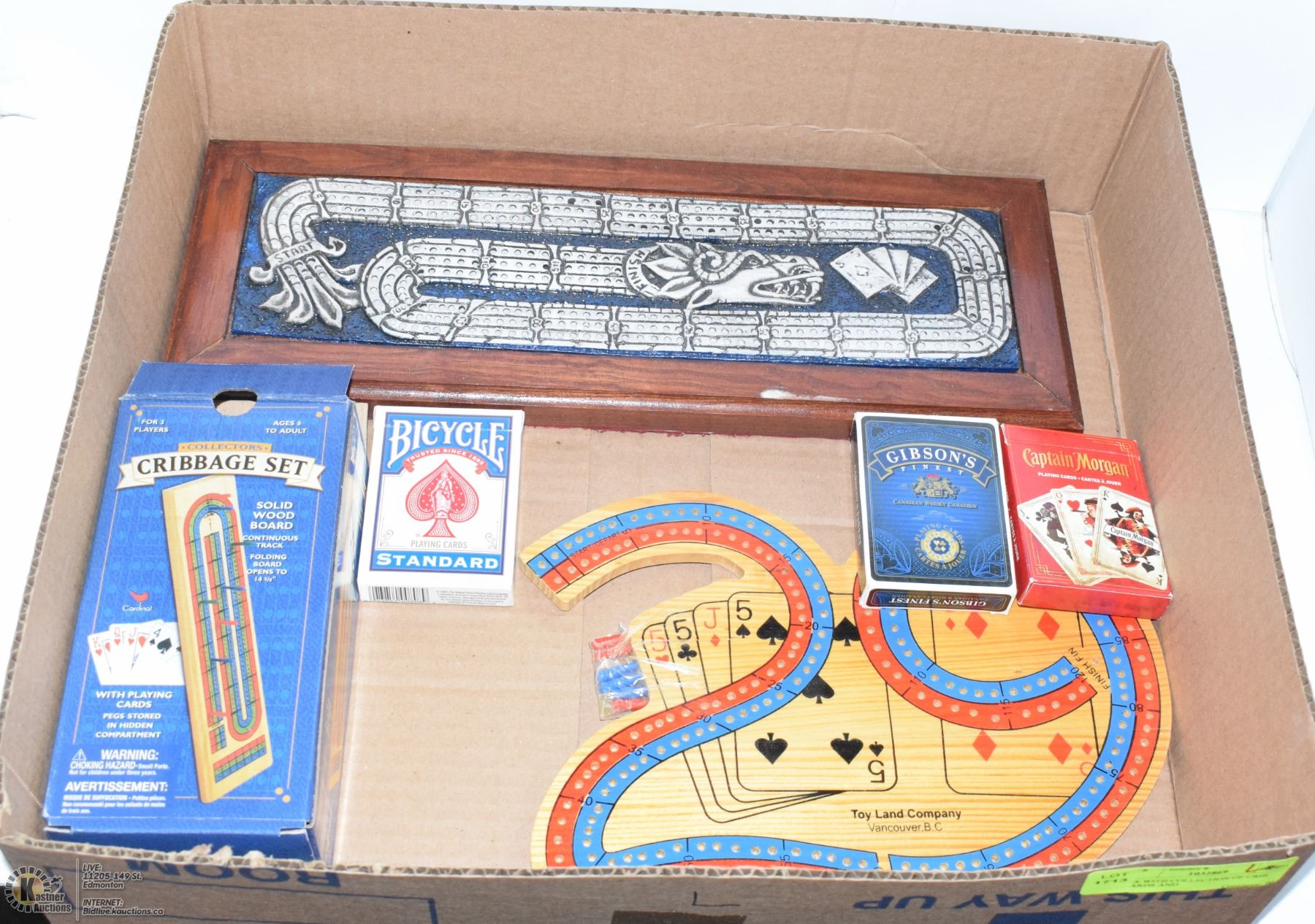 CARDS - INCL. NEW WOOD FOLD-UP TRAVEL BOARD, HAND MADE WOOD "DRAGON" BOARD AND SOLID WOOD "29" CRIB BOARD, 3 DECKS OF PLAYING CARDS