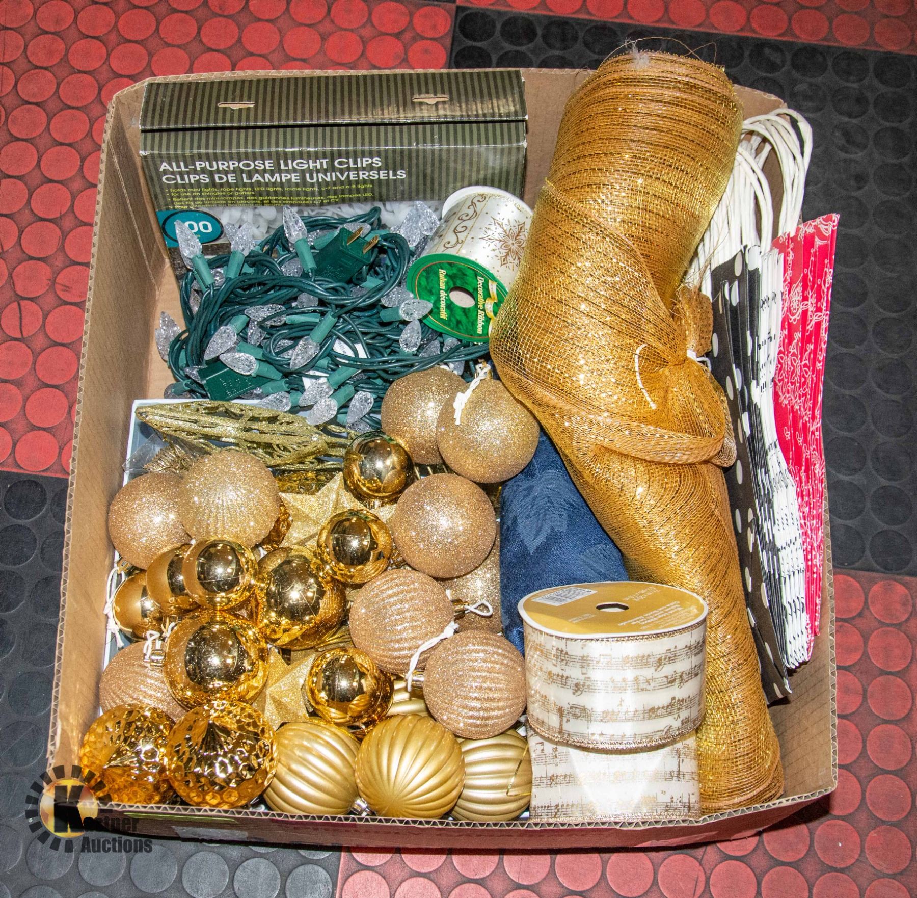 BOX WITH COLLECTION OF GOLD TREE DECOR,