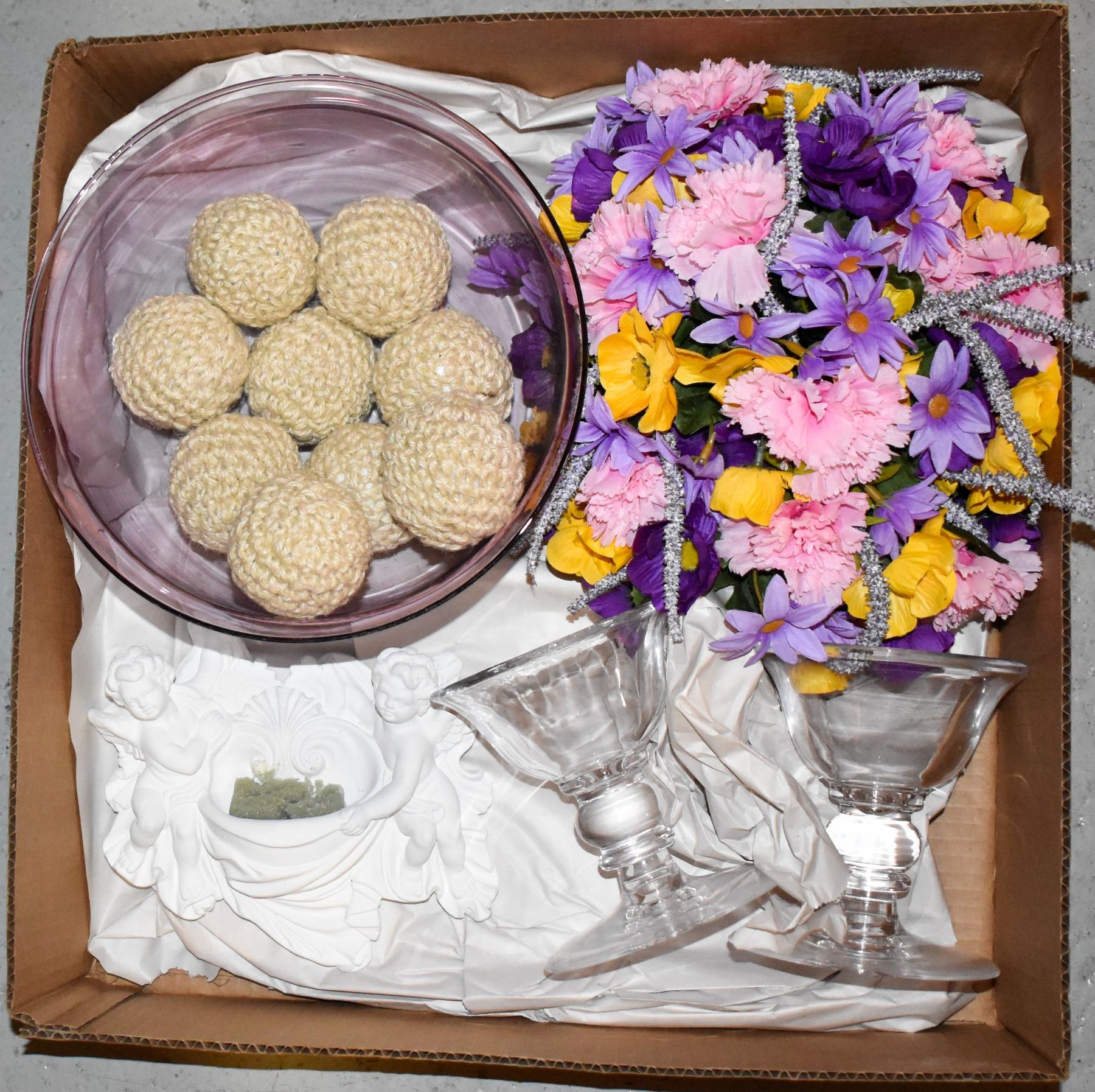 (10"-DIAM), BOUQUET OF FLOWERS IN POT, ANGELL WALL SCONCE & 2 DECORATIVE GLASS BOWLS