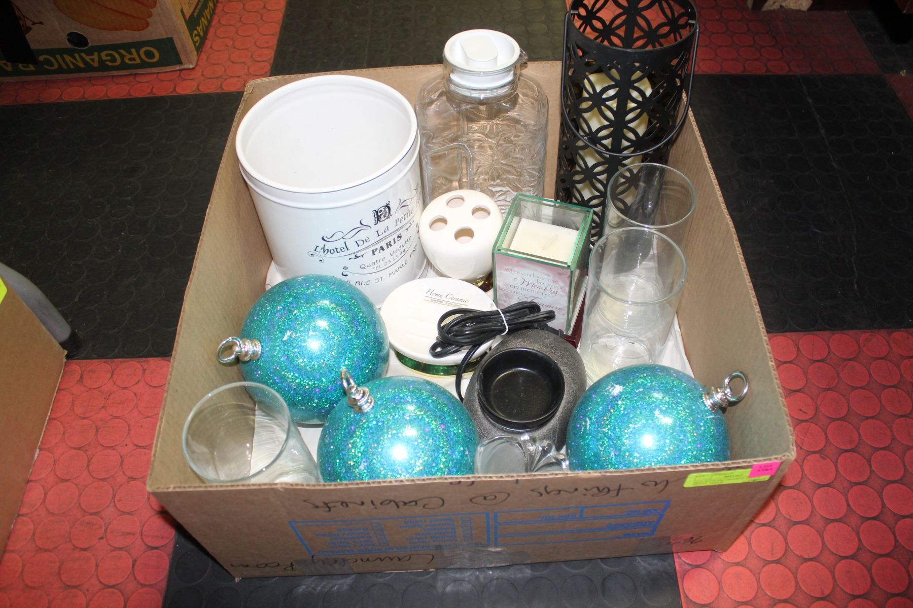 WITH TALL FLAMELESS CANDLE, DECORATIVE CERAMIC GARBAGE CAN, SCENTSY ROCK-STYLE WAX BURNER, MEMORY CANDLE, LARGE DECORATIVE HANGING BALLS & MORE