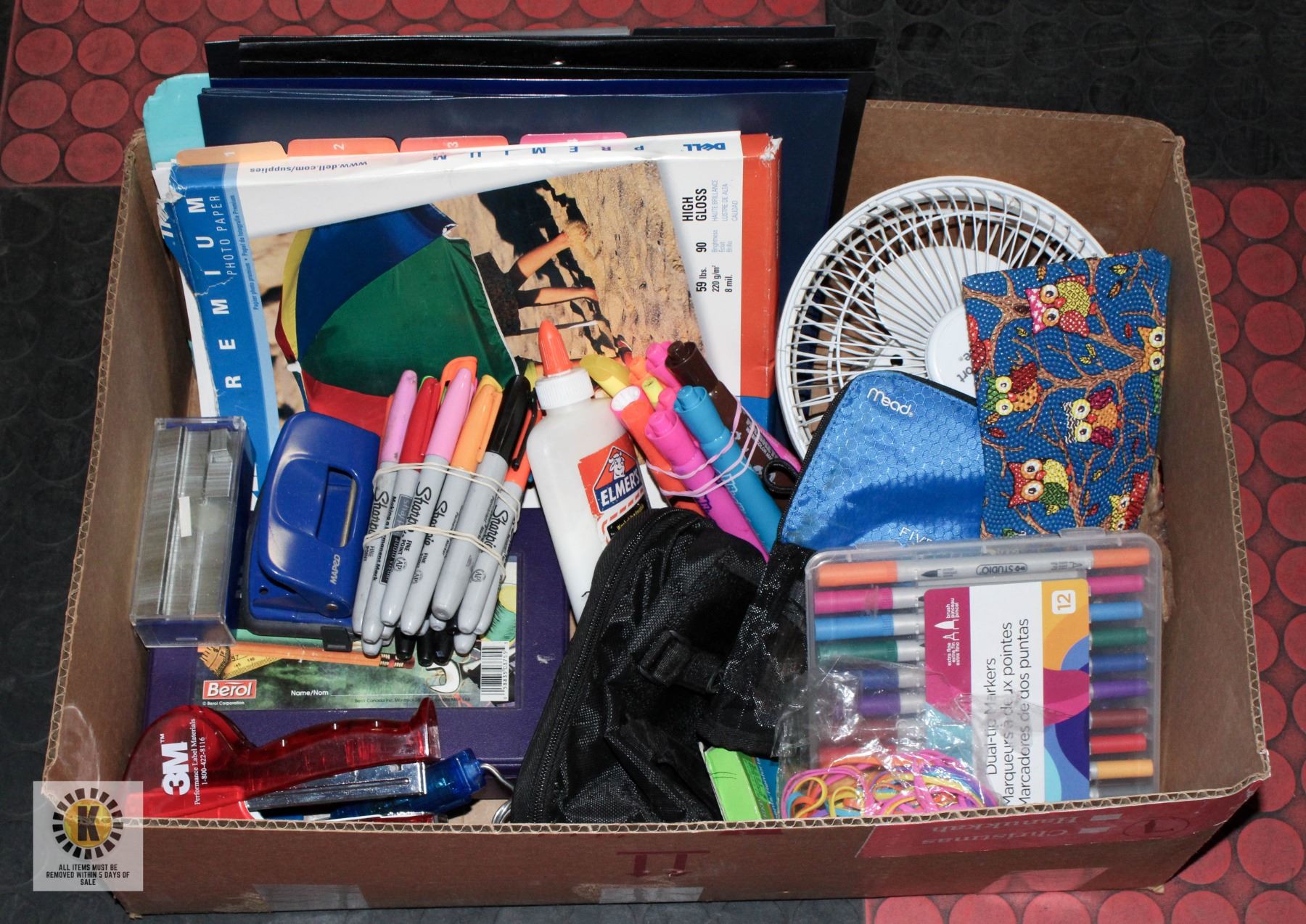 BOX WITH DESK/OFFICE SUPPLIES INCL. DESK FAN,