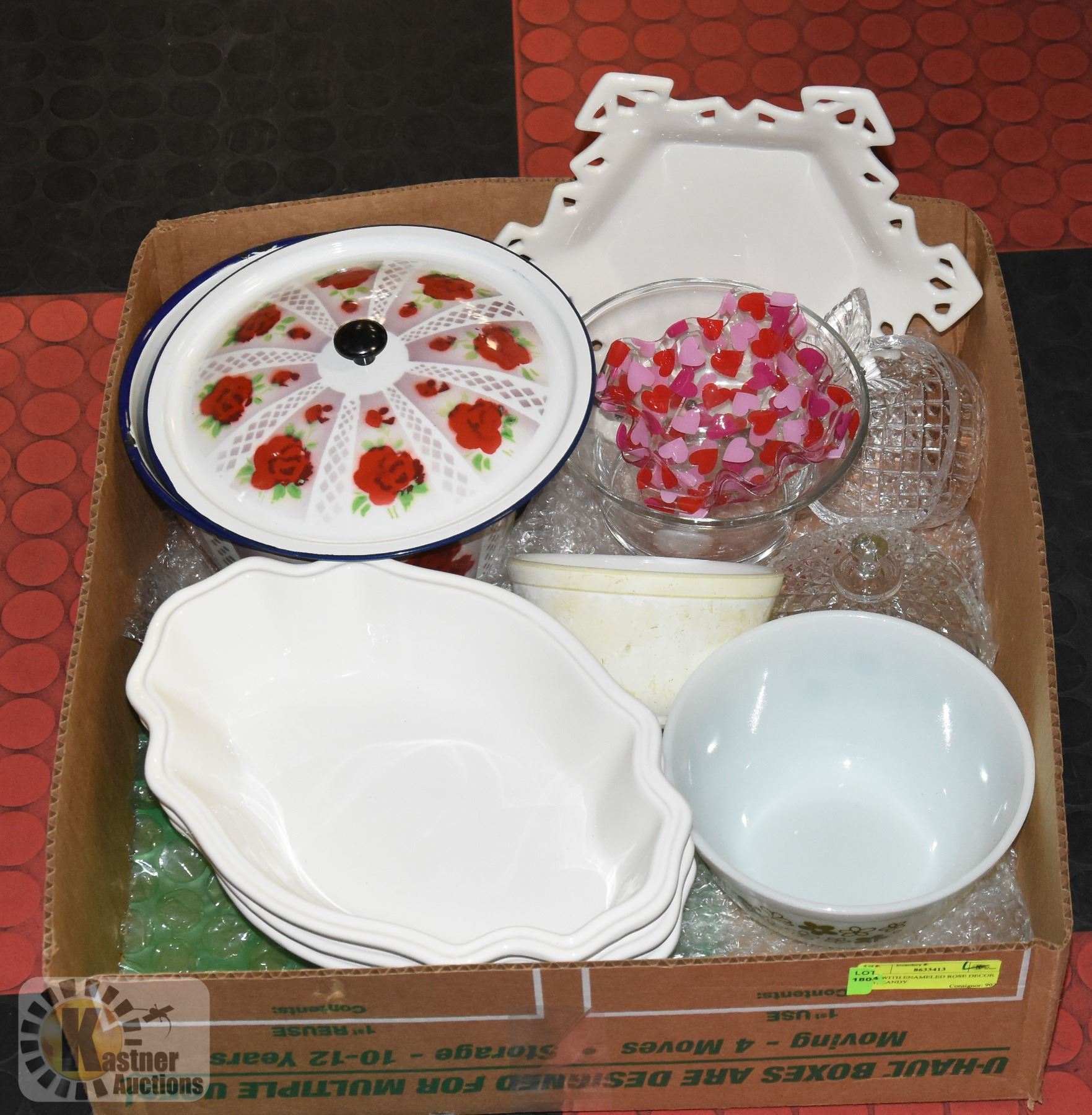 DISHES, 3 CERAMIC DISHWARE CONTAINERS, BUTTER DISH WITH LID, VINTAGE PYREX BOWLS, ETC.