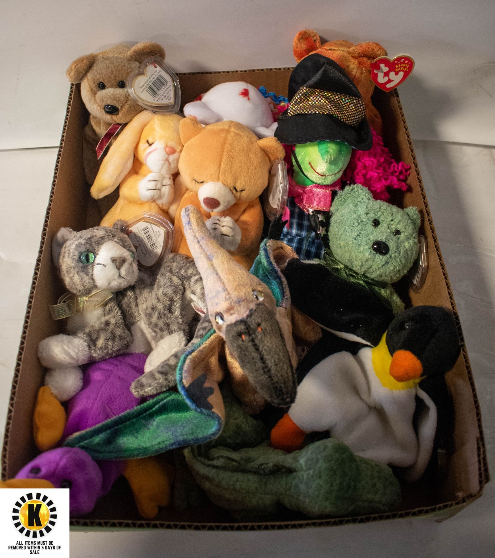 VARIOUS BEARS, PRAYING BUNNY, PRAYING BEAR, DUCK, ALLIGATOR, WITCH DOLL, PENGUIN, PTERODACTYL DINOSAUR, KITTY, ETC. - ALL WITH NAME TAGS (COUNT OF 12)