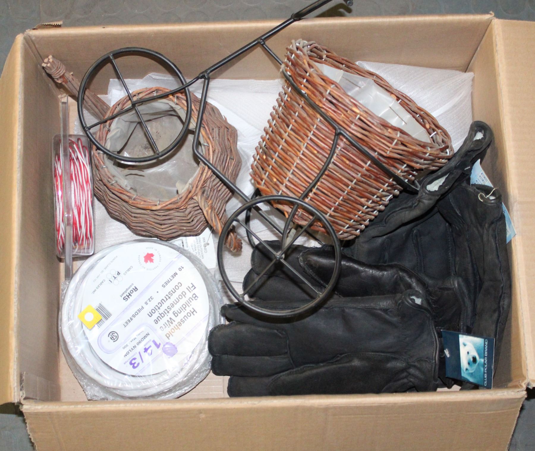 BOX WITH GLOVES, DECOR, & WIRE