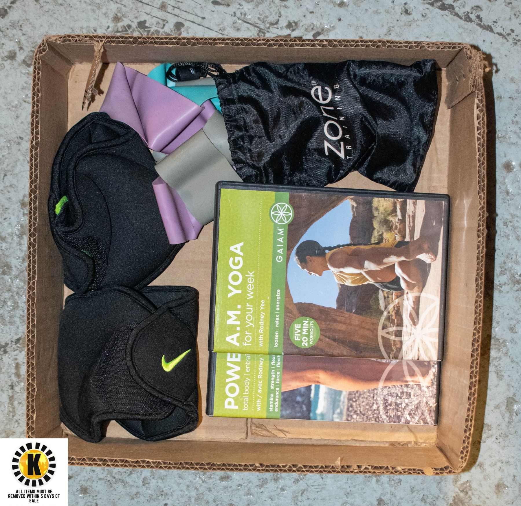 GAIAM YOGA DVDS, PAIR OF NIKE 2.5 LB SOFT VELCRO WEIGHTS (WRIST/ANKLE, ETC.), QUALITY "ZONE TRAINING" RESISTANCE BANDS SET - IN BAG