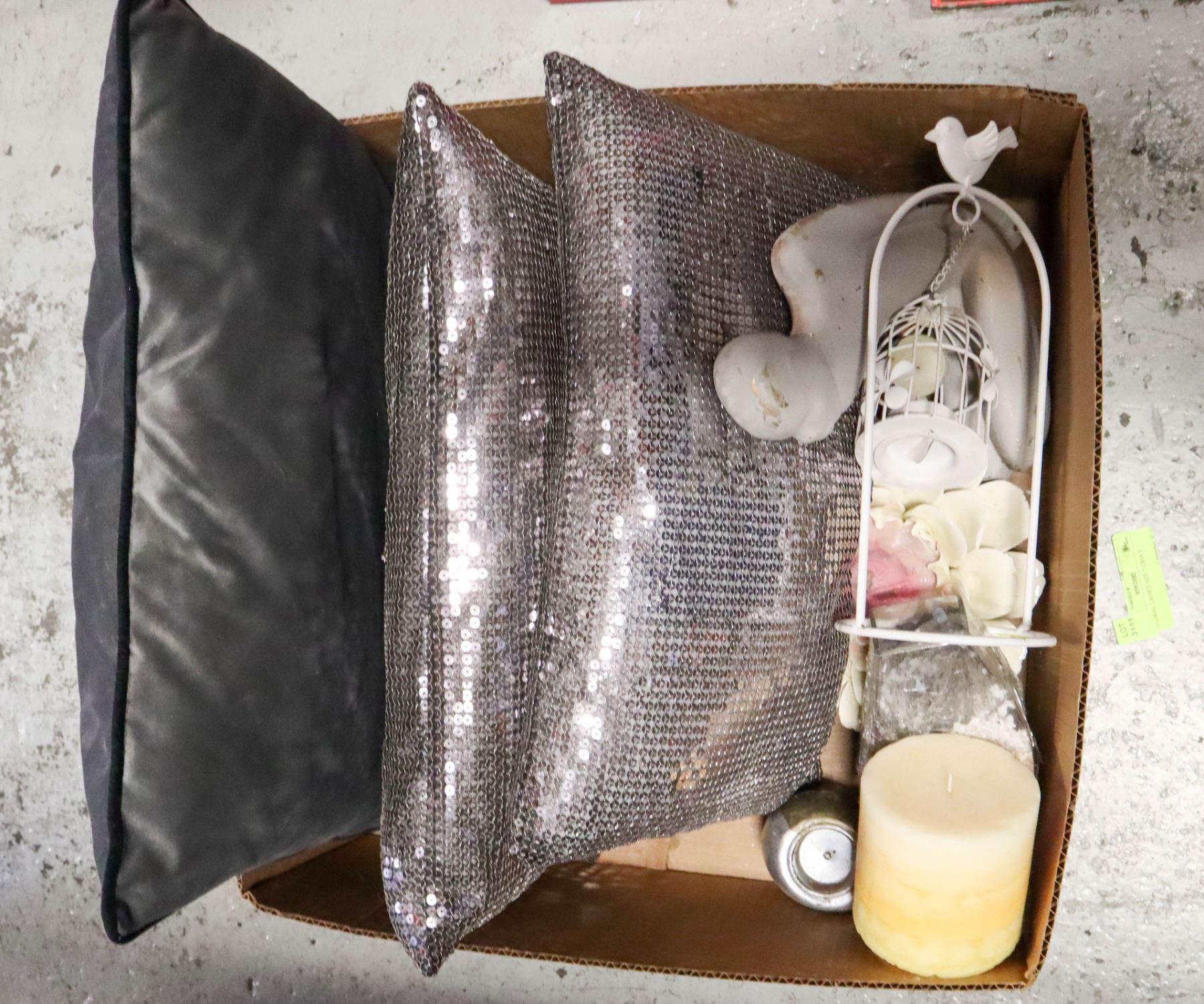 LARGE CANDLE, 2 SILVER SEQUIN PILLOWS, 1 GREY & BLACK PILLOW, BIRD CAGE VOTIVE