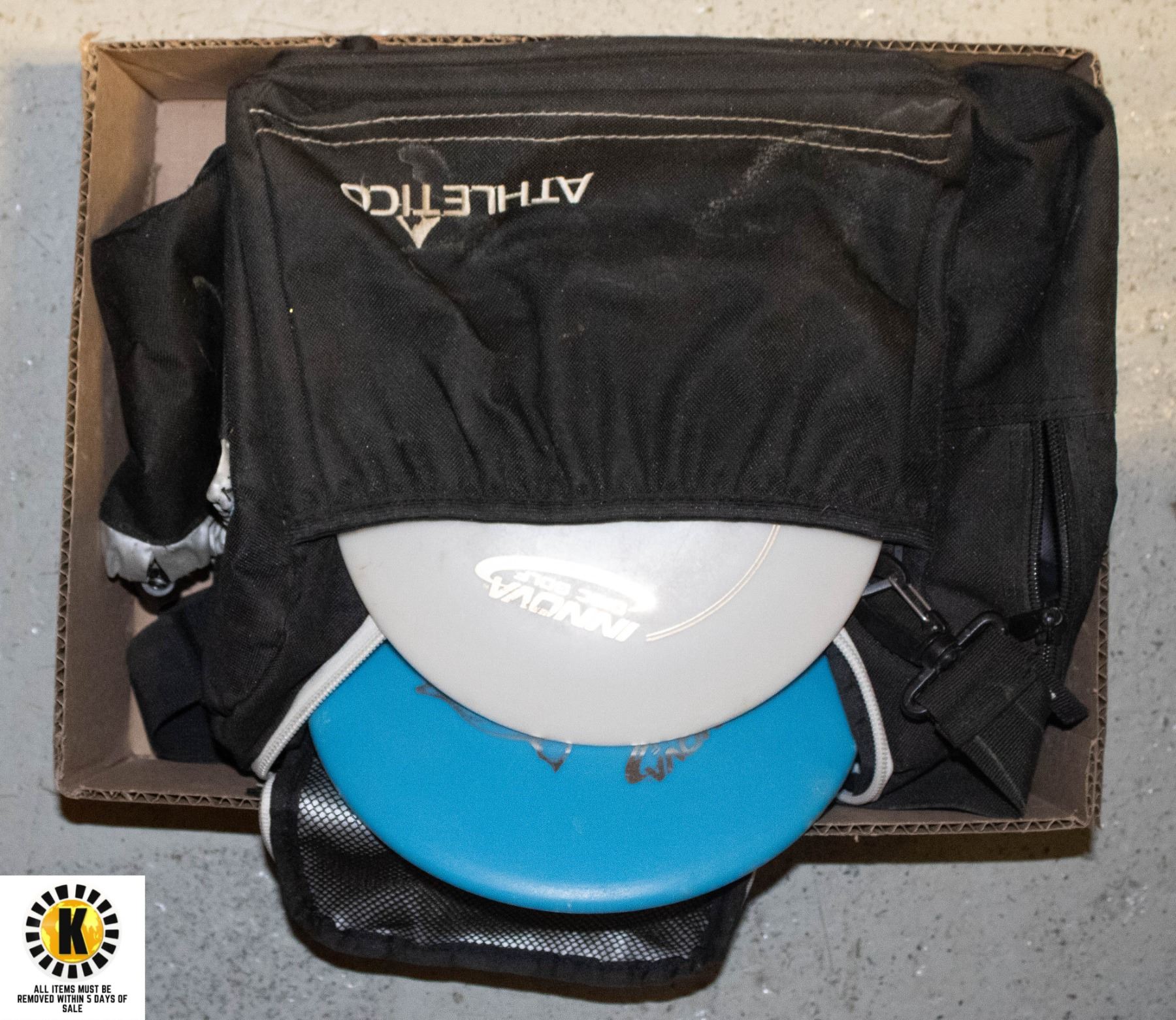 CASE INCLUDES 4 INNOVA GOLF DISCS, DOMINATOR DISTANCE DRIVER, LEOPARD FAIRWAY DRIVER, SHARK MID-RANGE AND AVIAR PUTT AND APPROACH WITH "ATHLETICO" BLACK CANVAS MULTI-POCKET SHOULDER BAG
