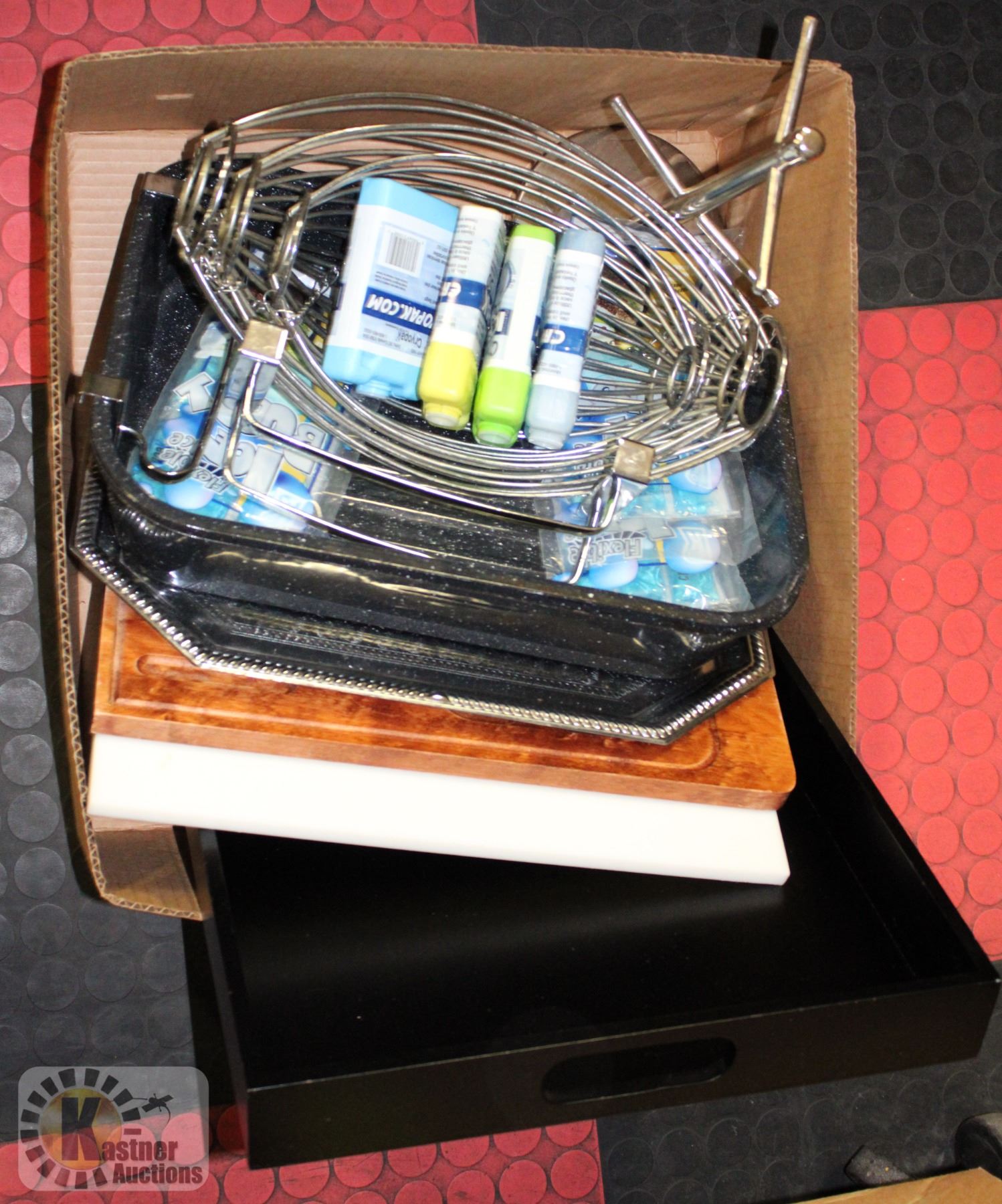 TRAY, WOOD CHEESE CUTTING BOARD, 2 ENAMEL ROASTERS, 3 PACKS OF FLEXIBLE ICE BUDDIES & 4 CRYOPAK ICE PACKS, CUP HOLDER AND MORE
