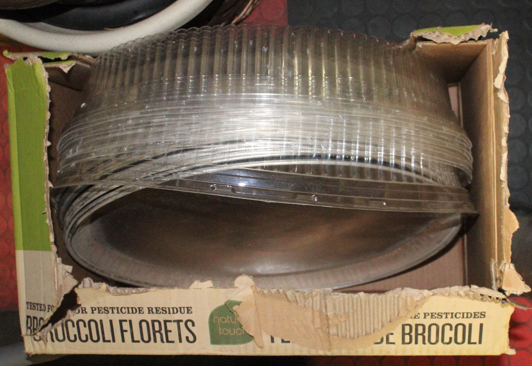 BOX WITH LARGE SERVING TRAYS WITH LIDS AND TONGS