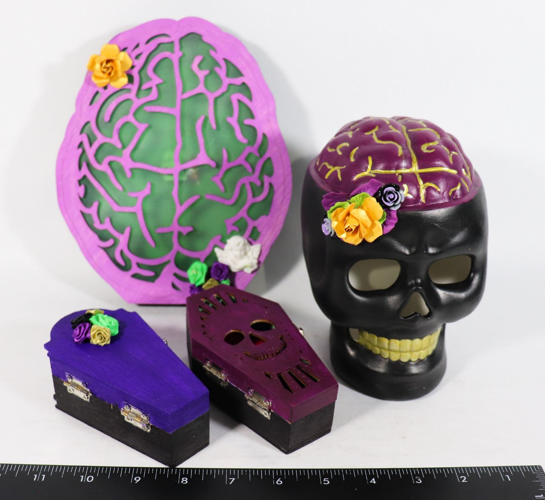 LIGHT UP SKULL BRAIN AND COFFIN FULL OF PENDANTS AND RINGS ALL WORKING LIGHTS