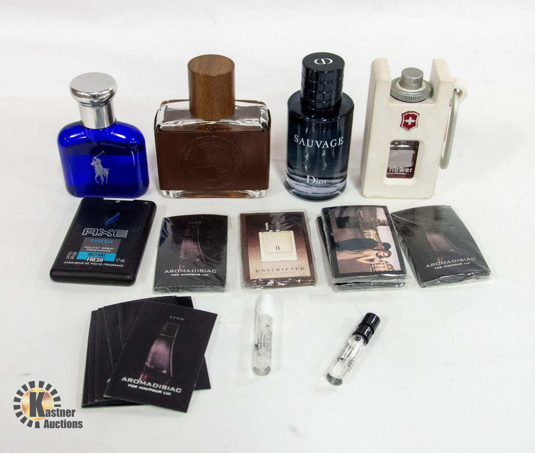 (90%+ FULL), POLO (75% FULL), VICTORINOX (40% FULL), DISTILLERY SERIES NEW YORK RYE (90%+ FULL). GUCCI & CK SAMPLE SPRAYS, AXE PHOENIX (POCKET SPRAY FRAGRANCE) AND 5 PACKS OF WIPE-ON PAD COLOGNES