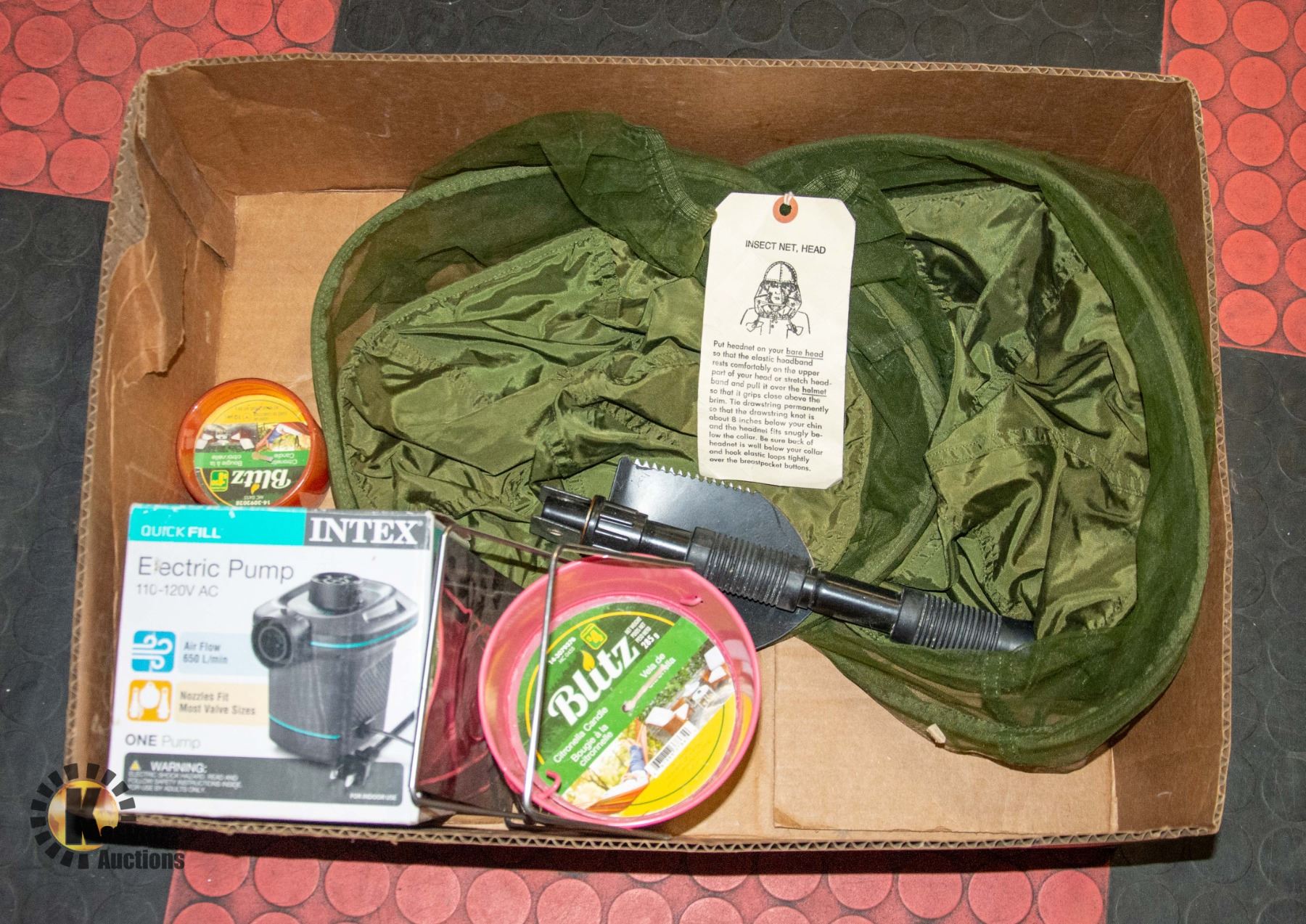 INCL. TWO NEW INSECT HEAD NETS, 2 NEW BLITZ CITRONELLA CANDLES, NEW INTEX ELECTRIC AIR PUMP, CAMPFIRE COOK-TOP, FOLD-AWAY MULTI-TOOL SURVIVAL SHOVEL **ALL ITEMS MUST BE REMOVED BY 5PM SATURDAY, JUNE 1ST 2024. ALL REMAINING ITEMS WILL BE SUBJECT TO A $6.00 PER DAY STORAGE CHARGE. ANY ITEMS REMAINING AFTER MONDAY, JUNE 17TH 2024 WILL BE CONSIDERED FORFEITED. NO REFUNDS WILL BE ISSUED FOR FORFEITED ITEMS. TO SCHEDULE A PICK UP APPOINTMENT CLICK HERE