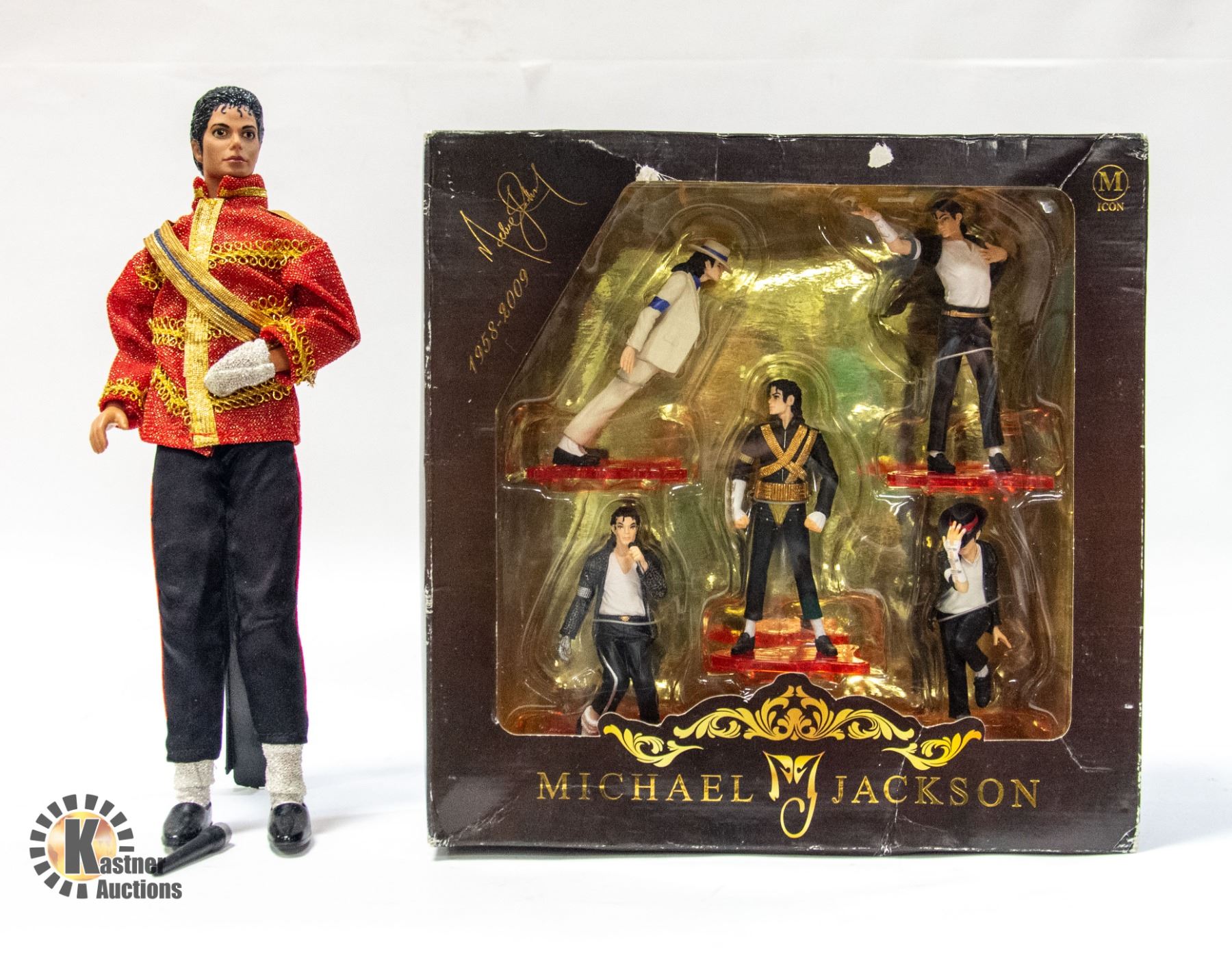JACKSON ACTION FIGURES ON STANDS AND 1 MICHAEL JACKSON FULL SIZE DOLL DRESSED IN GRAMMY AWARD OUTFIT     **ALL ITEMS MUST BE REMOVED BY 5PM SATURDAY, JULY 8ST 2023. ALL REMAINING ITEMS WILL BE SUBJECT TO A $6.00 PER DAY STORAGE CHARGE. ANY ITEMS REMAINING AFTER MONDAY, JULY 24TH, 2023 WILL BE CONSIDERED FORFEITED. NO REFUNDS WILL BE ISSUED FOR FORFEITED ITEMS. TO SCHEDULE A PICK UP APPOINTMENT CLICK HERE