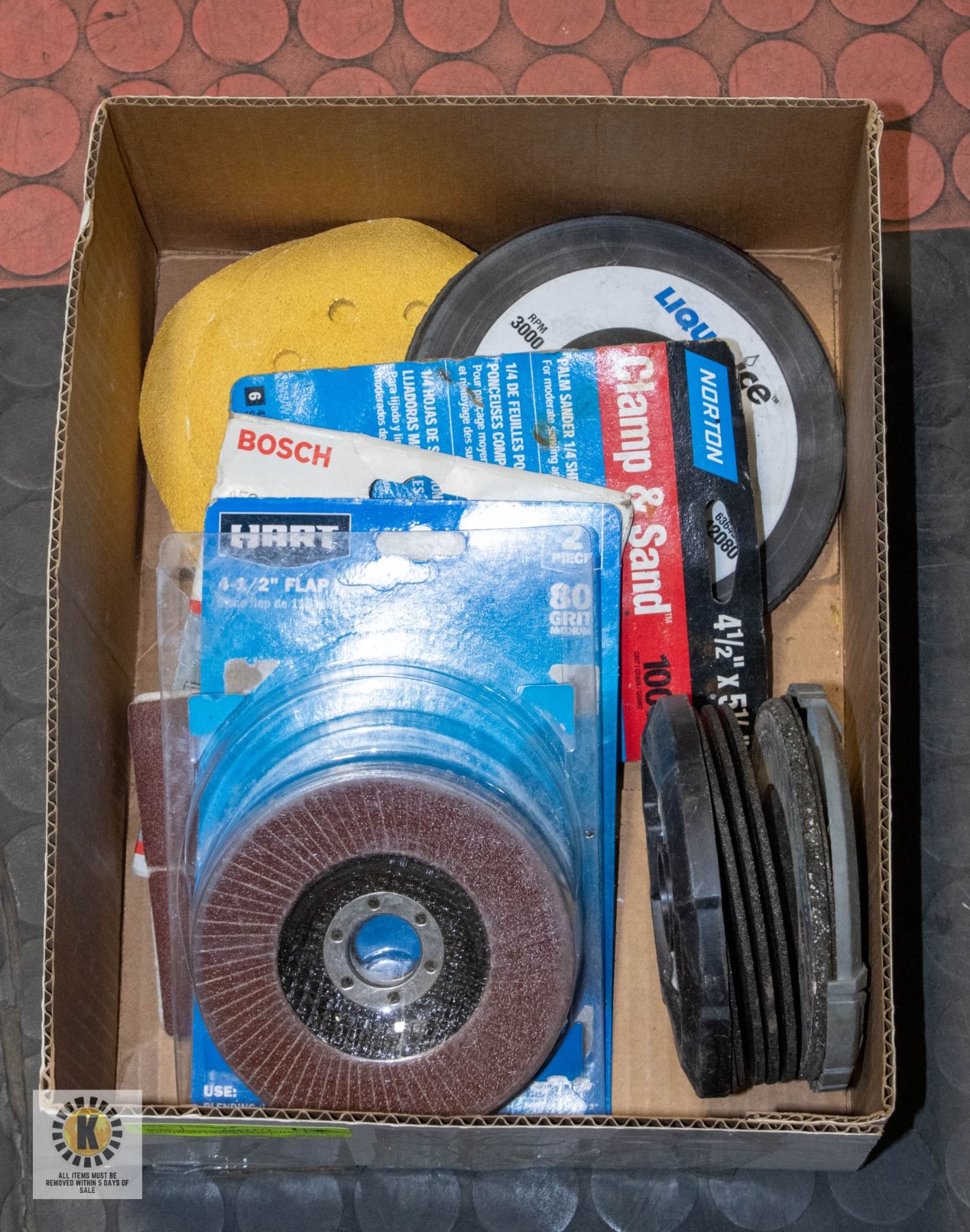 INCL. NEW HART 4 1/2" 80 GRIT FLAPPER DISCS, 7 NEW GRINDING DISCS IN STORAGE CONTAINER - 3 TYPES, LIQUIDICE 3000 HPM VELCRO DISC SANDER, ASSORTMENT OF NEW SAND PAPERS **ALL ITEMS MUST BE REMOVED BY 5PM SATURDAY, APRIL 3RD 2025. ALL REMAINING ITEMS WILL BE SUBJECT TO A $6.00 PER DAY STORAGE CHARGE. ANY ITEMS REMAINING AFTER MONDAY, MAY 19TH 2025 WILL BE CONSIDERED FORFEITED. NO REFUNDS WILL BE ISSUED FOR FORFEITED ITEMS. TO SCHEDULE A PICK UP APPOINTMENT CLICK HERE