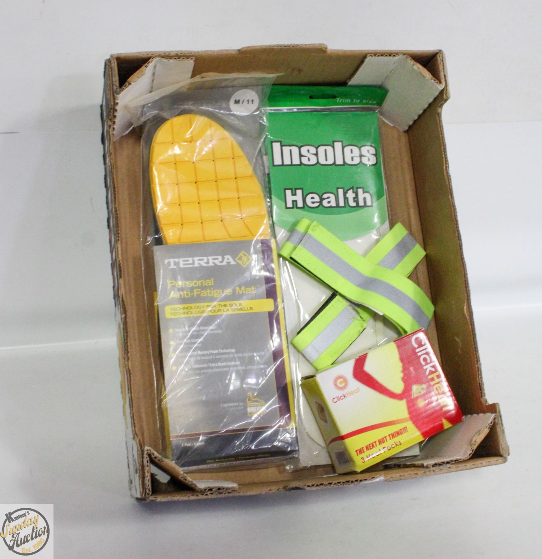 MAT INDUSTRIAL INSOLES (SIZE M / 11), 2 HIGH-VIS ANKLE STRAPS, 2 SETS OF TRIM-TO-SIZE INSOLES FOR LADIES OR MEN, AND BOX OF CLICK HEAT PACKS **ALL ITEMS MUST BE REMOVED BY 5PM SATURDAY, NOVEMBER 29TH 2025. ALL REMAINING ITEMS WILL BE SUBJECT TO A $6.00 PER DAY STORAGE CHARGE. ANY ITEMS REMAINING AFTER MONDAY, DECEMBER 15TH 2025 WILL BE CONSIDERED FORFEITED. NO REFUNDS WILL BE ISSUED FOR FORFEITED ITEMS. TO SCHEDULE A PICK UP APPOINTMENT CLICK HERE