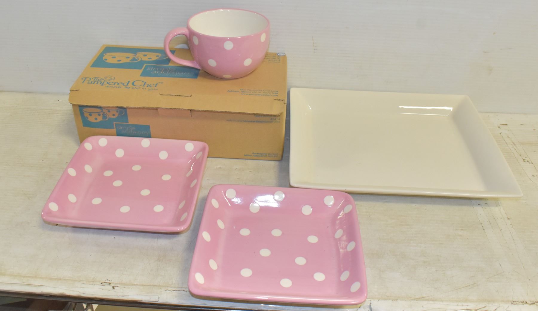 POLKA DOT "HELP WHIP CANCER" MUGS, 2 MATCHING DESERT PLATES AND LARGE PORCELAIN SERVING PLATTER**ALL ITEMS MUST BE REMOVED BY 5PM MONDAY, OCTOBER 17TH, 2022. ALL REMAINING ITEMS WILL BE SUBJECT TO A $6.00 PER DAY STORAGE CHARGE. ANY ITEMS REMAINING AFTER MONDAY, OCTOBER 29, 2022 WILL BE CONSIDERED FORFEITED. NO REFUNDS WILL BE ISSUED FOR FORFEITED ITEMS. TO SCHEDULE A PICK UP APPOINTMENT CLICK HERE