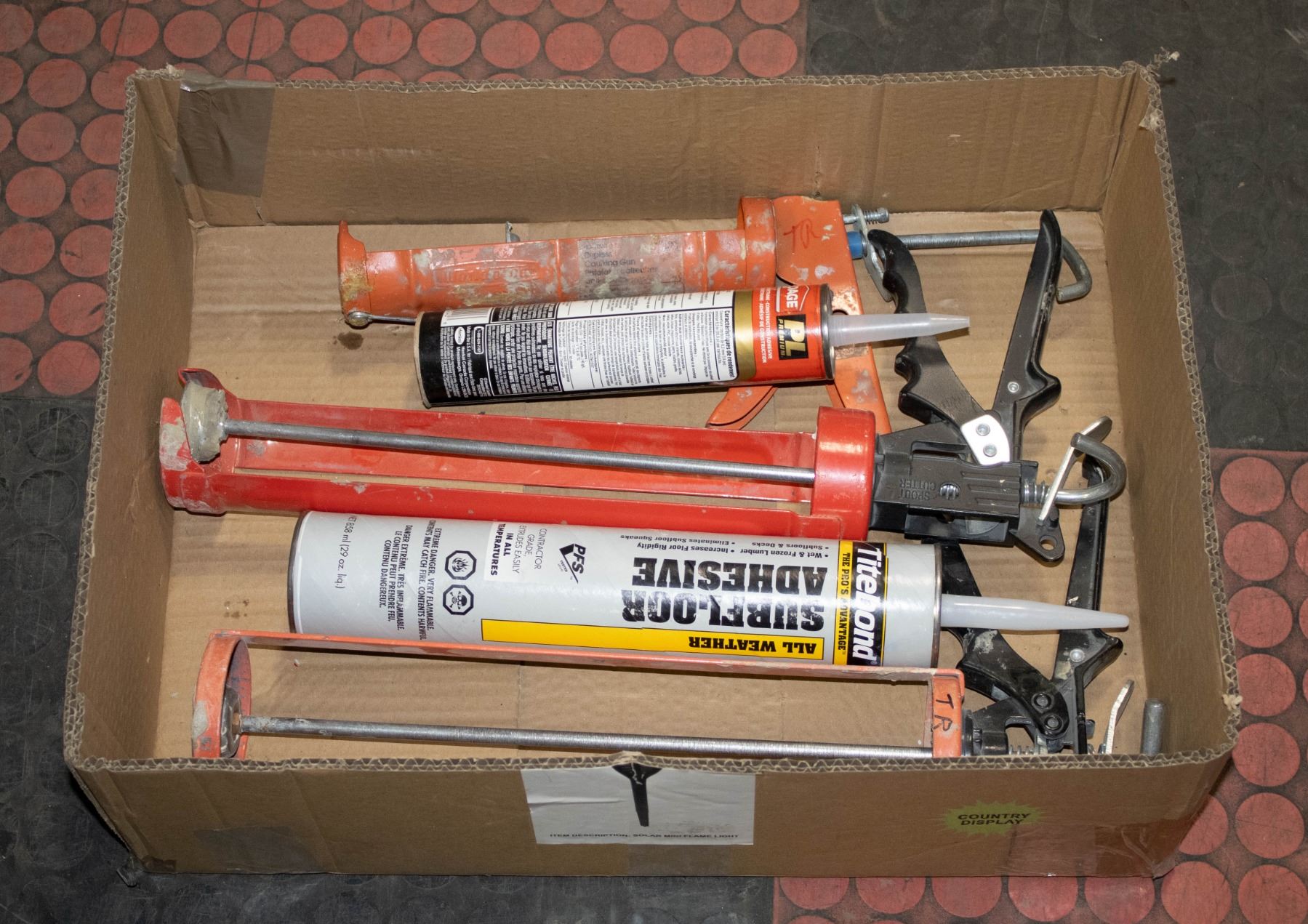 FLOOR ADHESIVE, NEW LEPAGE PL PREMIUM CONSTRUCTION ADHESIVE AND 3 PRO-QUALITY CAULKING GUNS. **ALL ITEMS MUST BE REMOVED BY 5PM SATURDAY, APRIL 12TH 2025. ALL REMAINING ITEMS WILL BE SUBJECT TO A $6.00 PER DAY STORAGE CHARGE. ANY ITEMS REMAINING AFTER MONDAY, APRIL 28TH 2025 WILL BE CONSIDERED FORFEITED. NO REFUNDS WILL BE ISSUED FOR FORFEITED ITEMS. TO SCHEDULE A PICK UP APPOINTMENT CLICK HERE