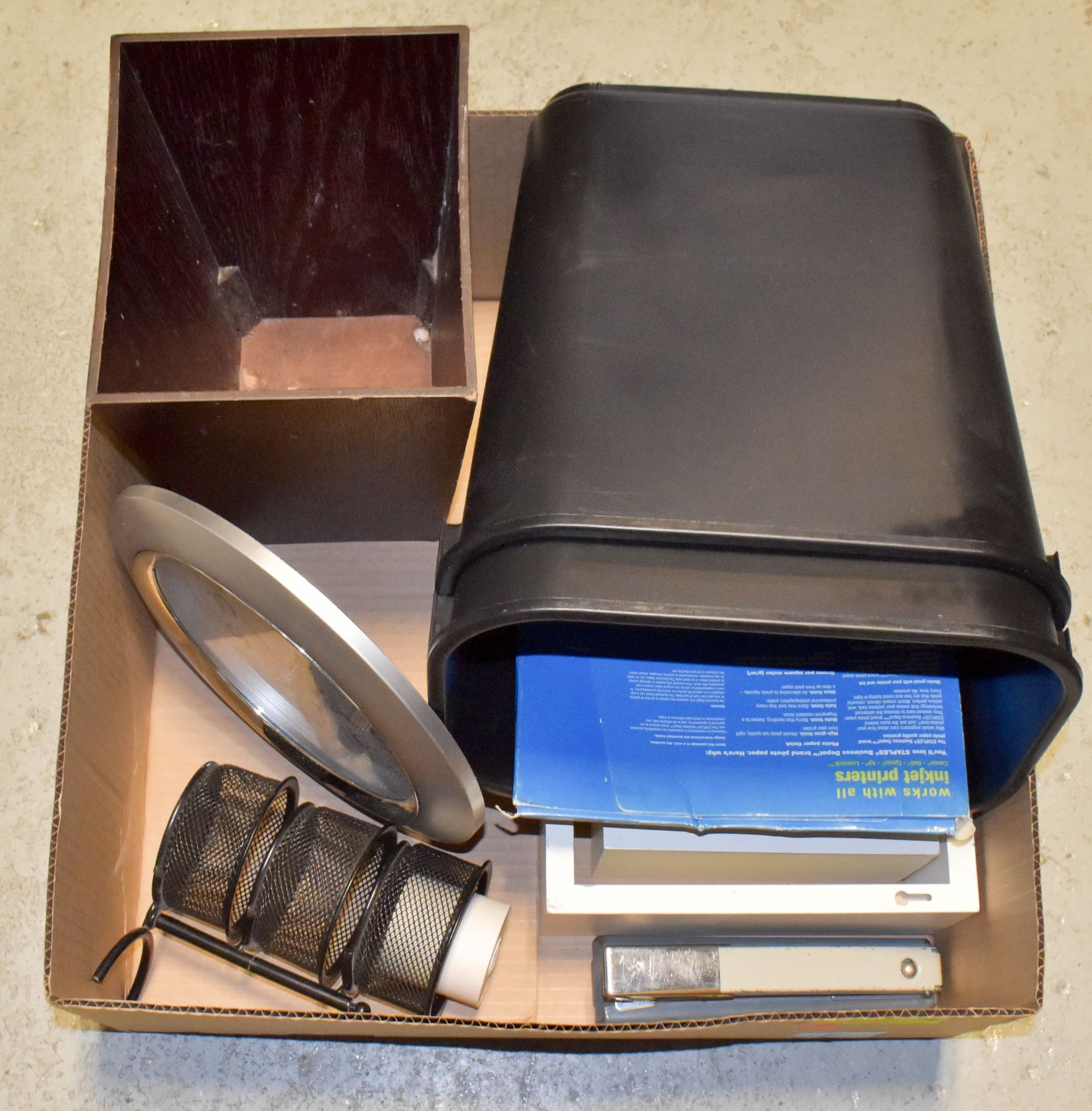 GARBAGE CANS, 3-TIER MULTI-USE SORTER, PHOTO PAPER, 3-PIECE WHITE WALL MOUNT DECOR, 1 WOOD GARBAGE CAN, WORKING CLOCK, ETC.