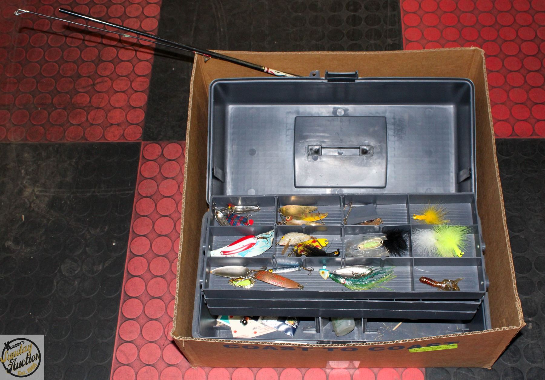 BOX FULL OF NEW AND SEASONED FISHING TACKLE AND ACCESSORIES, INCL. ZEBCO 5 FT. MEDIUM ACTION ROD, LOTS OF NEW TACKLE AND LINE IN 3-TIER NYLON PLASTIC CLAMP-DOWN CASE **ALL ITEMS MUST BE REMOVED BY 5PM SATURDAY, MAY 10TH 2025. ALL REMAINING ITEMS WILL BE SUBJECT TO A $6.00 PER DAY STORAGE CHARGE. ANY ITEMS REMAINING AFTER MONDAY, MAY 26TH 2025 WILL BE CONSIDERED FORFEITED. NO REFUNDS WILL BE ISSUED FOR FORFEITED ITEMS. TO SCHEDULE A PICK UP APPOINTMENT CLICK HERE