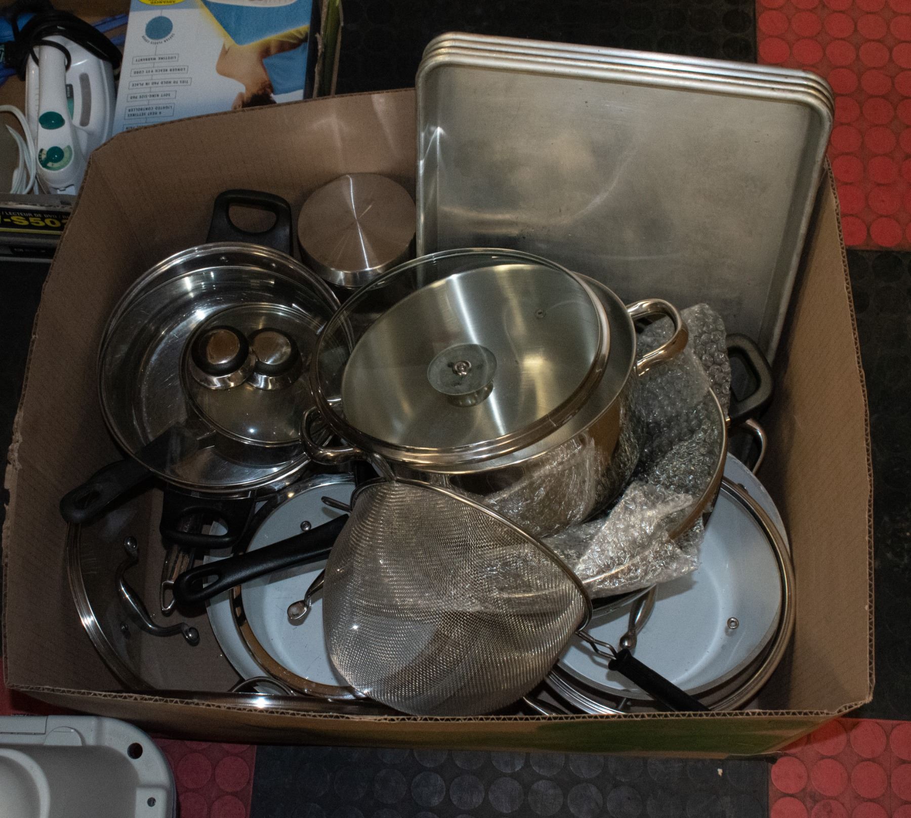 INCL. LAGOSTINA WHITE CLAD SET, TRAMONTINA LARGE NON-STICK DEEP PAN WITH LID, S.S. STEW POTS, LARGE STRAINER, 4 COOKIE SHEETS/BAKE PANS, ETC. **ALL ITEMS MUST BE REMOVED BY 5PM SATURDAY, JANUARY 28TH 2023. **ALL REMAINING ITEMS WILL BE SUBJECT TO A $6.00 PER DAY STORAGE CHARGE. ANY ITEMS REMAINING AFTER MONDAY, FEBRUARY 13TH, 2023 WILL BE CONSIDERED FORFEITED. NO REFUNDS WILL BE ISSUED FOR FORFEITED ITEMS. TO SCHEDULE A PICK UP APPOINTMENT CLICK HERE