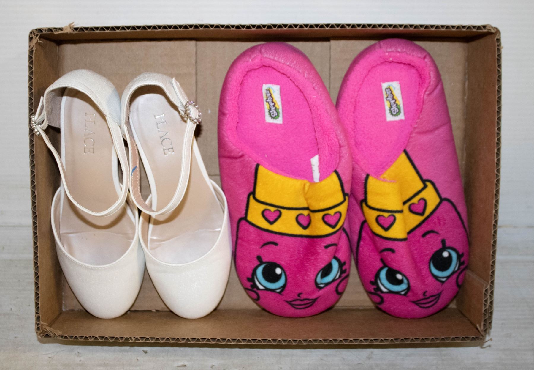 SHOES (SIZE 1) AND A PAIR OF SHOPKINS PINK SLIPPERS (SIZE 2-3)