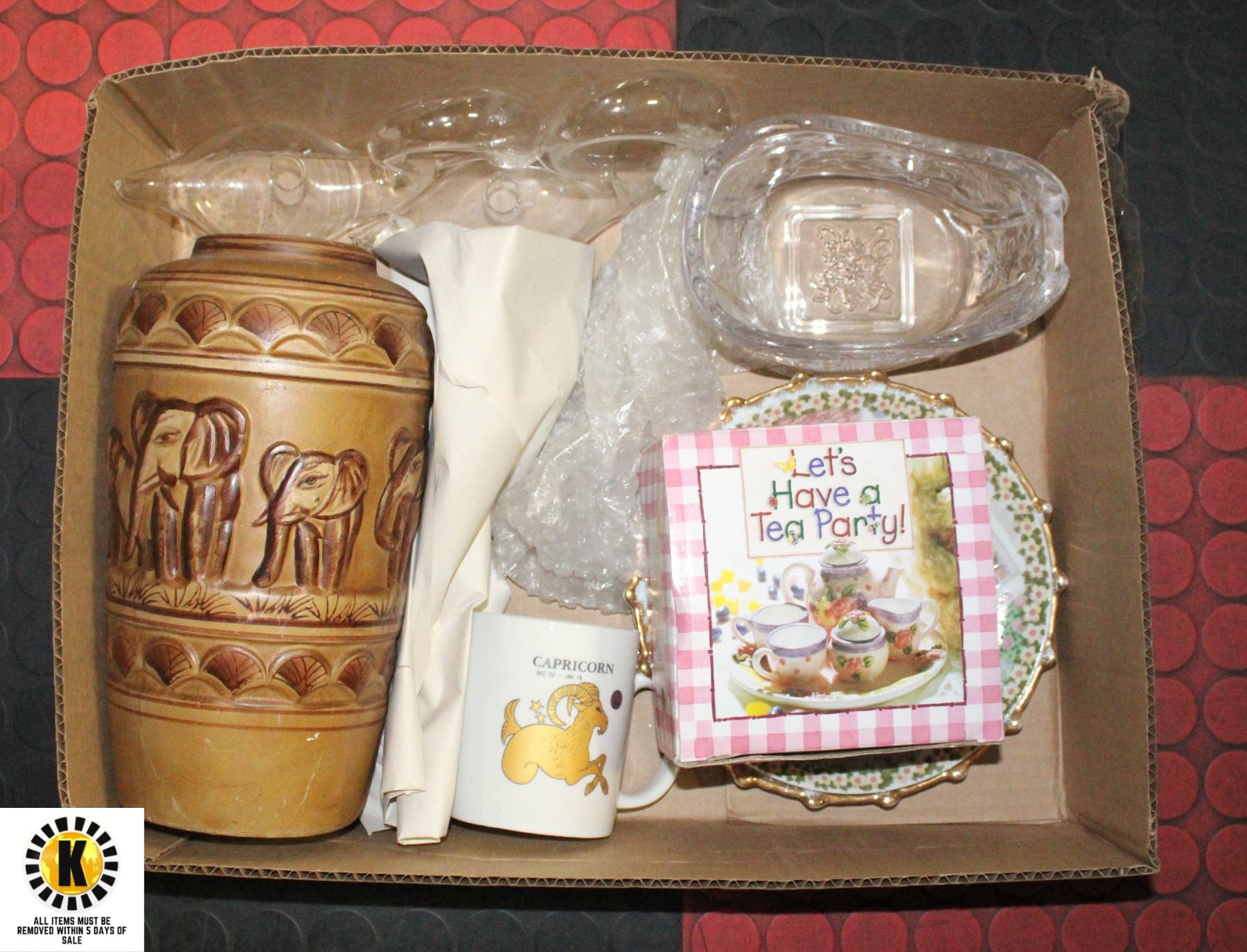 CANDY DISH, DECORATIVE ELEPHANT ETCHED VASE, DECORATIVE PLATES, CAPRICORN COFFEE CUP, NEW TEA PARTY SET, ETC. **ALL ITEMS MUST BE REMOVED BY 5PM SATURDAY, AUGUST 5TH 2023. ALL REMAINING ITEMS WILL BE SUBJECT TO A $6.00 PER DAY STORAGE CHARGE. ANY ITEMS REMAINING AFTER MONDAY, AUGUST 21ST, 2023 WILL BE CONSIDERED FORFEITED. NO REFUNDS WILL BE ISSUED FOR FORFEITED ITEMS. TO SCHEDULE A PICK UP APPOINTMENT CLICK HERE