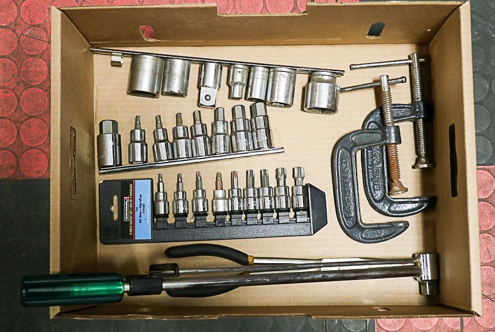 BOX WITH SOCKETS, TOURQUE WRENCH & MORE