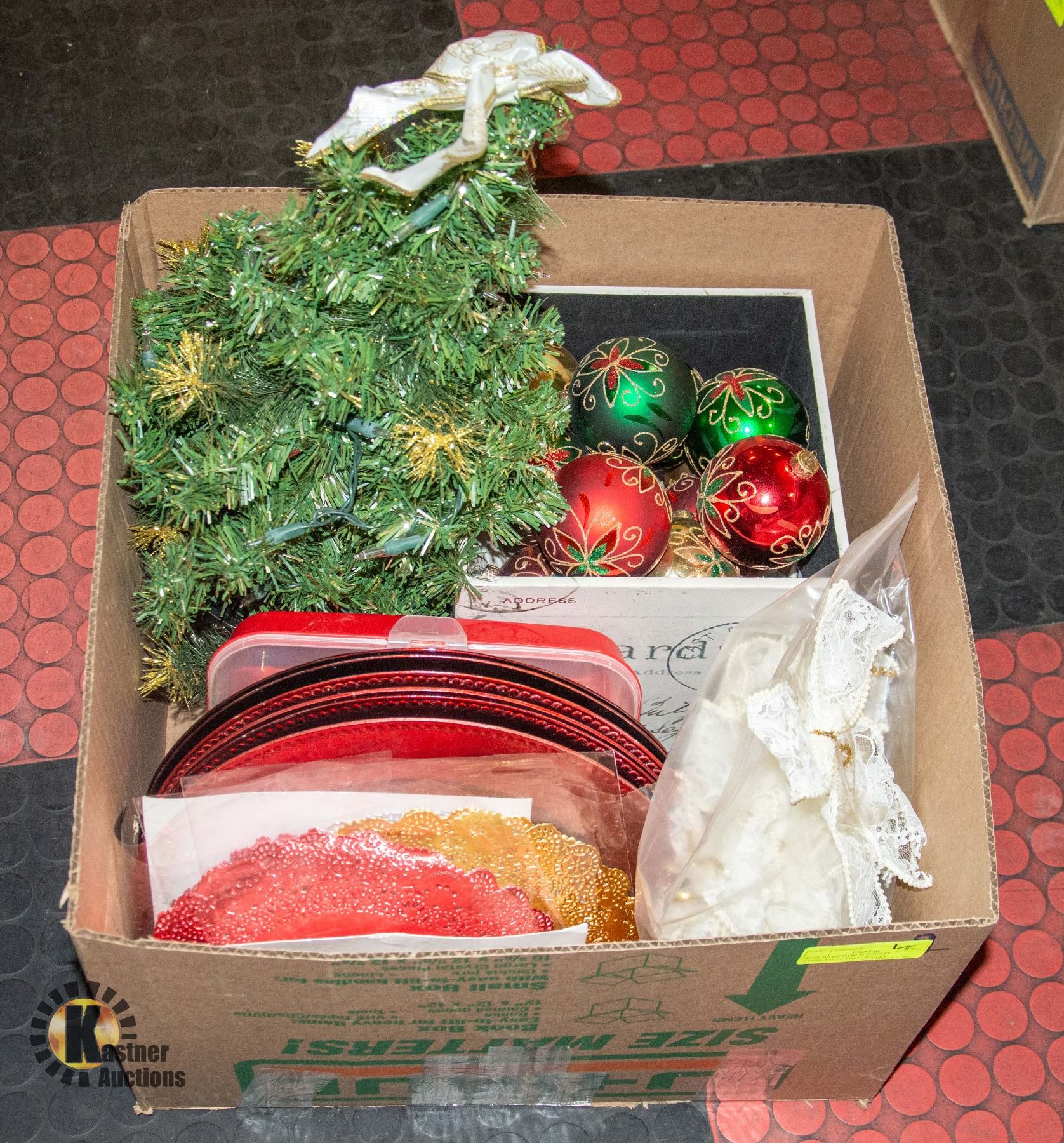 DECORATIVE BOX WITH TREE BULBS, CHRISTMAS PLATES, BAG OF RIBBON, TREE BOWS WITH BEADED EDGES, 9-CUPCAKE STORAGE & MORE **ALL ITEMS MUST BE REMOVED BY 5PM SATURDAY, DECEMBER 7TH 2024. ALL REMAINING ITEMS WILL BE SUBJECT TO A $6.00 PER DAY STORAGE CHARGE. ANY ITEMS REMAINING AFTER MONDAY, DECEMBER 23RD 2024 WILL BE CONSIDERED FORFEITED. NO REFUNDS WILL BE ISSUED FOR FORFEITED ITEMS. TO SCHEDULE A PICK UP APPOINTMENT CLICK HERE