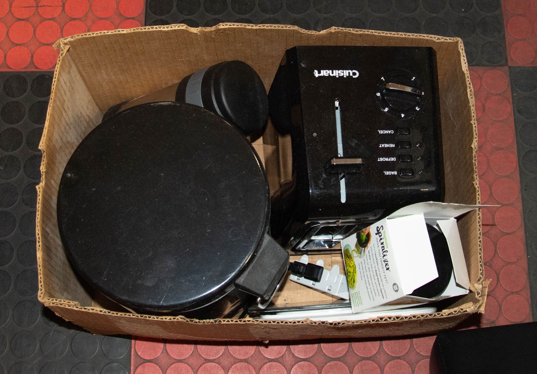 BOX WITH TOASTER, DIGITAL SCALE, GARBAGE CAN,