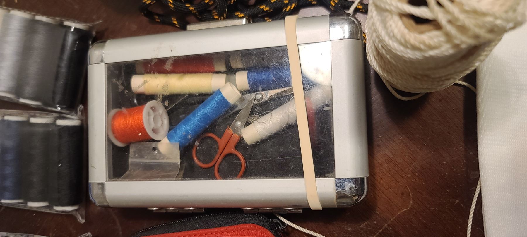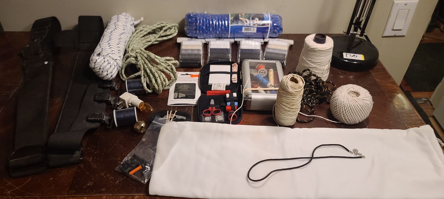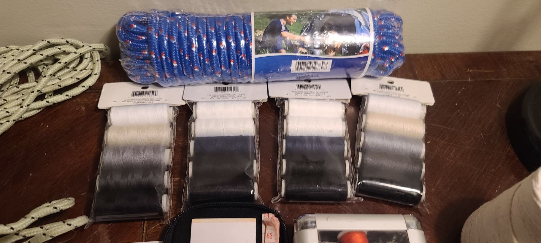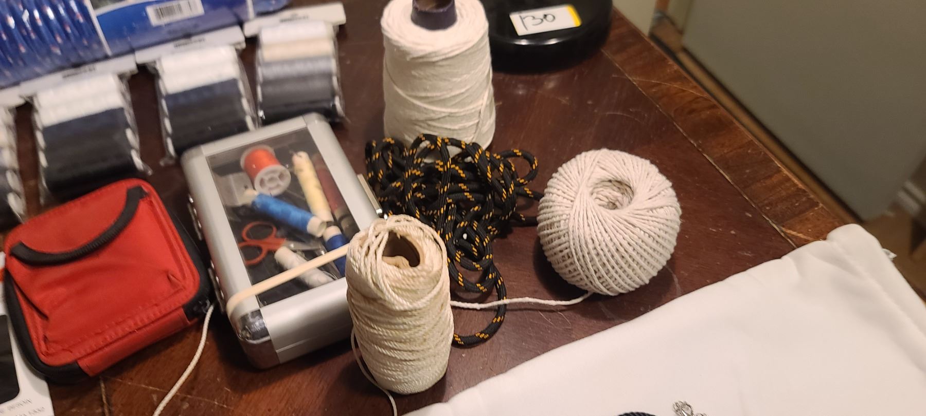 BOX WITH TWO 100 ROLLS OF ROPE AND SEWING SUPPLIES