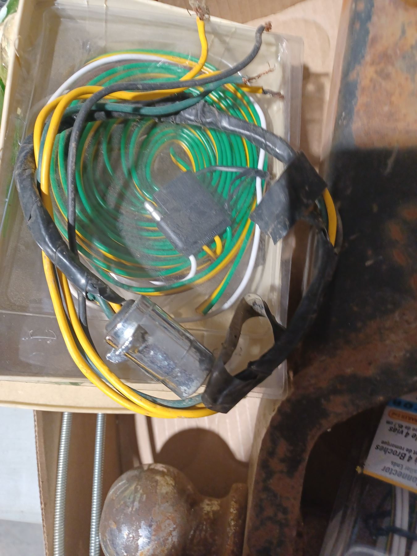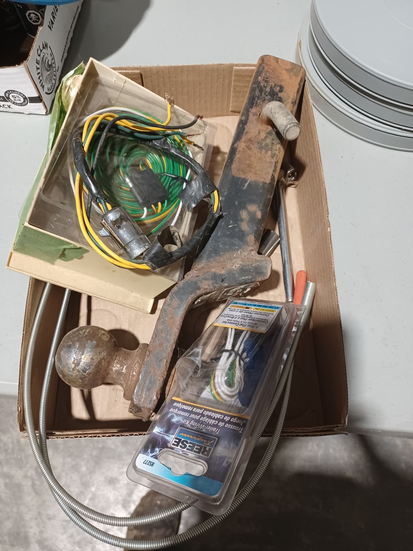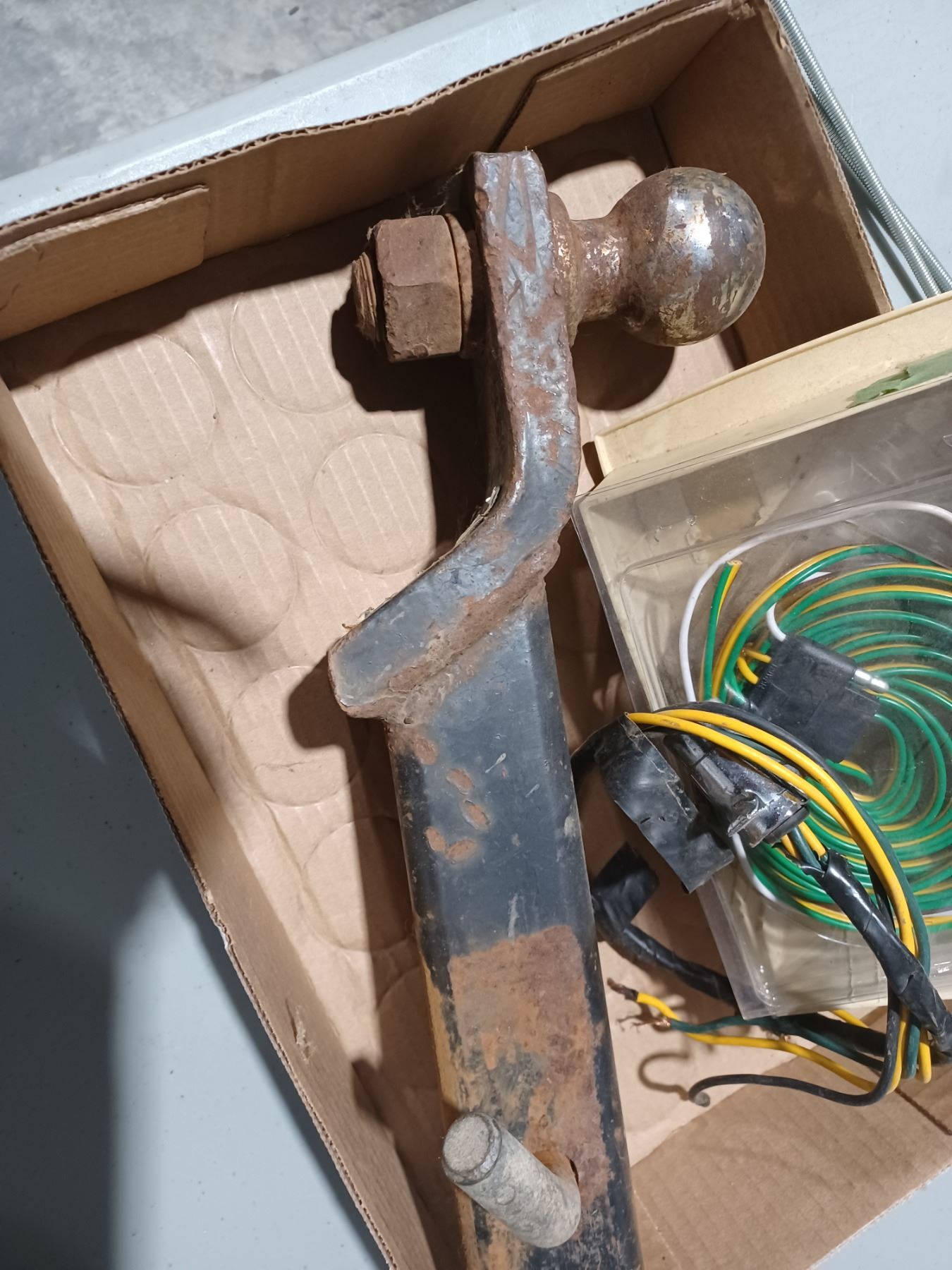 BOX WITH TWO PICKUP TOOLS, TRAILER HITCH 2" BALL AND TRAILER WIRING