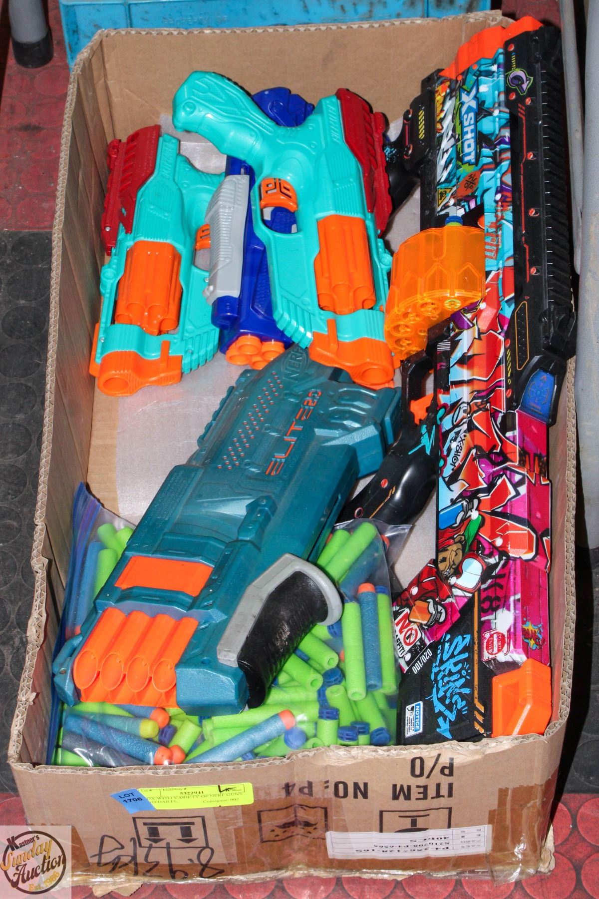 BOX WITH VARIETY OF NERF GUNS AND DARTS,