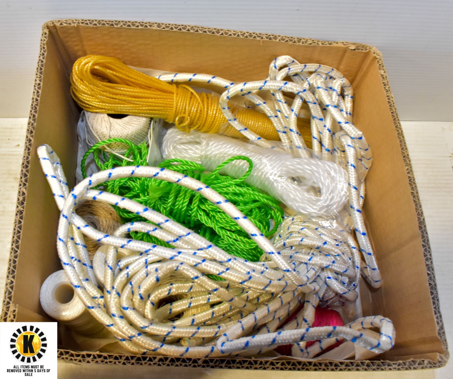 BOX WITH VARIETY OF NEW ROPE, STRING AND